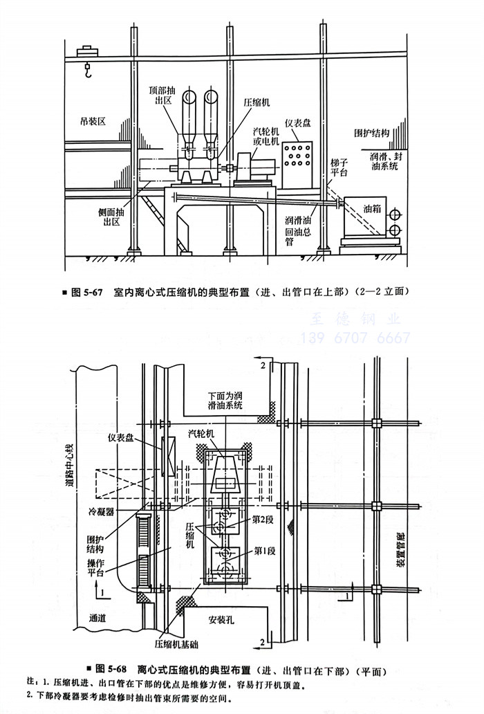 室內離心式壓(ya)縮(suo)機的典型布置(進、出管口在上部)(圖5-65~圖5-67)
