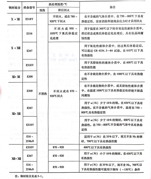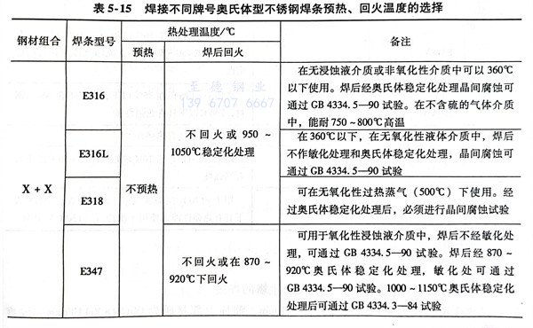 有關不(bu)同牌號的奧氏體型不(bu)銹鋼管(guan)焊(han)接時(shi),焊(han)條、預熱(re)和回(hui)火溫度的選擇見表5-15。