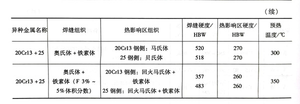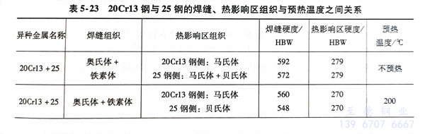 這類異種鋼副焊接時同樣存在焊縫稀釋和形成過渡層的問題。如果焊接材料選擇不當,導致珠光體鋼一側焊縫出現低碳層,而馬氏體鋼緊貼焊縫一側的碳含量降低,變成了鐵素體組織,并使該焊接接頭的焊縫組織成為奧氏體+鐵素體。鐵素體的晶粒粗大而軟化,最后會出現低塑性或低應力的或兩者兼備的區帶,極容易遭到破壞。有關馬氏不銹鋼(20Cr13)與珠光體鋼(25鋼)的焊縫及熱影響區的組織與預熱溫度之間關系見表5-23。