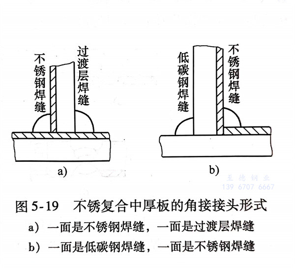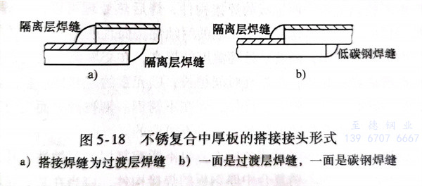 不銹(xiu)(xiu)鋼(gang)(gang)復(fu)合(he)中厚鋼(gang)(gang)板的(de)搭(da)接(jie)(jie)接(jie)(jie)頭(tou)和角(jiao)接(jie)(jie)接(jie)(jie)頭(tou)形式如(ru)圖5-18和圖5-19所示。在待焊區中碳鋼(gang)(gang)和不銹(xiu)(xiu)鋼(gang)(gang)的(de)共存部位,要(yao)選用(yong)(yong)(yong)過渡層(ceng)(ceng)的(de)焊接(jie)(jie)材(cai)(cai)料(liao)。待焊處都是碳鋼(gang)(gang)時(shi)(shi),可以按基層(ceng)(ceng)所選用(yong)(yong)(yong)的(de)焊接(jie)(jie)材(cai)(cai)料(liao)進行施(shi)焊;同樣,待焊區都是不銹(xiu)(xiu)鋼(gang)(gang)材(cai)(cai)料(liao)時(shi)(shi),理應選用(yong)(yong)(yong)復(fu)層(ceng)(ceng)的(de)焊接(jie)(jie)材(cai)(cai)料(liao),但考慮到焊接(jie)(jie)熔池(chi)的(de)深度,可能將基層(ceng)(ceng)熔化,此時(shi)(shi)第一層(ceng)(ceng)焊縫仍(reng)要(yao)選用(yong)(yong)(yong)過渡層(ceng)(ceng)的(de)焊接(jie)(jie)材(cai)(cai)料(liao),切不可忽視。