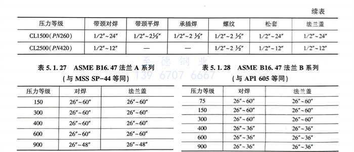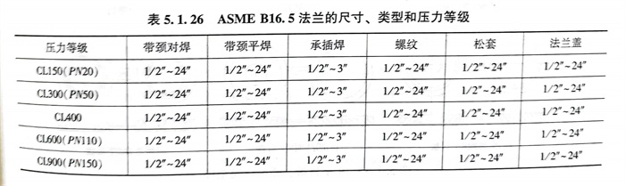 并非所有類型的法蘭都具備全尺寸和全壓力等級范圍,ASME B16.5和ASME B16.47法蘭的尺寸、類型和壓力等級見表5.1.26~表5.1.28。