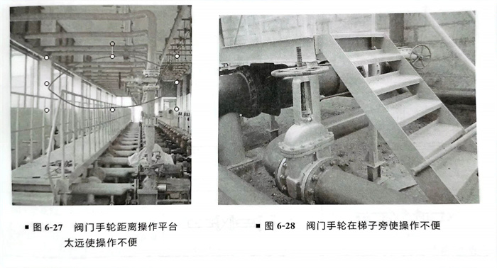 ①. 閥門應設在容易接近且便于操作、維修的地方。成排管道(如進出裝置的管道)上的閥(fa)門(men)應集中布置,并考慮設操作平臺及梯子(圖6-26)。地面以下管道上的閥門應設在閥井內,必要時,應設置閥門延伸桿。消防水閥井應有明顯的標志。