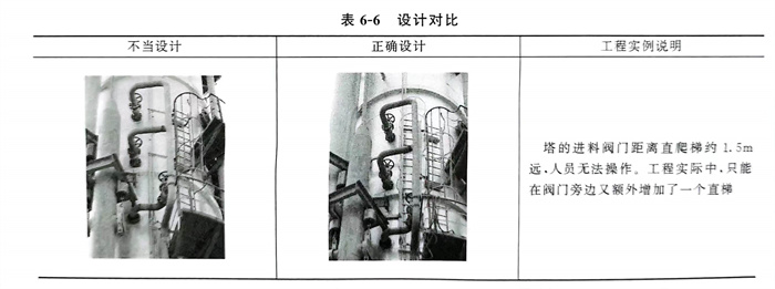 ④. 布(bu)置在操(cao)作平(ping)(ping)臺(tai)(tai)周圍的閥門(men)的中心距(ju)操(cao)作平(ping)(ping)臺(tai)(tai)邊緣不宜(yi)大于450mm,當閥桿和手輪(lun)伸(shen)入平(ping)(ping)臺(tai)(tai)上方且高度小(xiao)于2m時,應注(zhu)意不影響操(cao)作和通行(圖(tu)6-27、圖(tu)6-28、表6-6)。