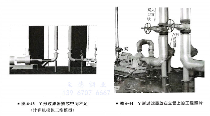 圖(tu)6-43所示某工(gong)程設計實例,Y形(xing)(xing)過(guo)濾(lv)器放(fang)置(zhi)于(yu)水平管(guan)(guan),由(you)于(yu)設計失誤,造(zao)成(cheng)Y形(xing)(xing)過(guo)濾(lv)器距(ju)離地(di)面很近,其抽芯空間不足(zu)。圖(tu)6-44所示為該工(gong)程施工(gong)照(zhao)片,把(ba)Y形(xing)(xing)過(guo)濾(lv)器放(fang)在(zai)立(li)管(guan)(guan)上(shang)(shang),注意避免使上(shang)(shang)面的操(cao)作閥門手輪中心(xin)標高超過(guo)1.8m而造(zao)成(cheng)操(cao)作上(shang)(shang)的不方便。