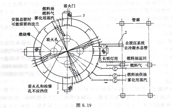 ⑧. 噴(pen)嘴(zui)的接管(guan)不(bu)(bu)得橫跨看火(huo)門(men)(men)(men),也不(bu)(bu)得影響(xiang)(xiang)看火(huo)門(men)(men)(men)的開閉(bi);噴(pen)嘴(zui)的接管(guan)也不(bu)(bu)應(ying)影響(xiang)(xiang)燃燒(shao)器及風箱(xiang)前(qian)板的拆卸,宜使用柔性(xing)管(guan)法蘭或(huo)活接頭與管(guan)嘴(zui)連接;閥門(men)(men)(men)應(ying)靠近看火(huo)門(men)(men)(men)并布置在右(或(huo)左)手側以(yi)便(bian)(bian)左(或(huo)右)手打開看火(huo)門(men)(men)(men),邊觀察邊調節閥門(men)(men)(men),全(quan)爐必須(xu)統一。長明(ming)燈的燃氣閥門(men)(men)(men)應(ying)靠近噴(pen)嘴(zui)安裝(噴(pen)嘴(zui)前(qian)第(di)一個閥門(men)(men)(men))以(yi)方便(bian)(bian)于噴(pen)嘴(zui)點火(huo),見圖8.19。