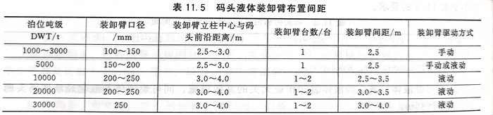 ②. 液體(ti)裝(zhuang)卸(xie)臂(bei)在碼頭上應合理布置(zhi),液體(ti)裝(zhuang)卸(xie)臂(bei)立(li)柱中心線至碼頭前沿(yan)的距離及(ji)液體(ti)裝(zhuang)卸(xie)臂(bei)間距可按表11.5選用。