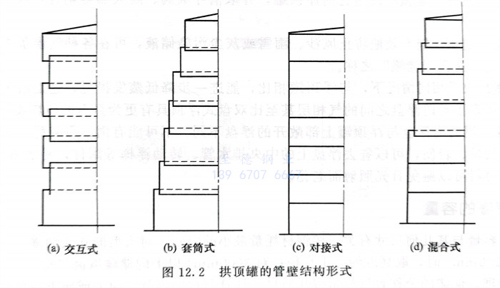 罐(guan)壁(bi)是主要受力部件,壁(bi)板的各縱焊縫采用(yong)對(dui)接(jie)(jie)(jie)焊,環(huan)焊縫采用(yong)套筒式或對(dui)接(jie)(jie)(jie)式,也有采用(yong)混合(he)式連接(jie)(jie)(jie),如圖12.2所(suo)示。拱頂(ding)罐(guan)的罐(guan)頂(ding)近似于球(qiu)(qiu)面,按截面形狀(zhuang)有準(zhun)球(qiu)(qiu)形拱頂(ding)和球(qiu)(qiu)形拱(gong)頂兩(liang)種,見圖12.3。拱(gong)頂油罐由(you)于(yu)氣相空間(jian)大(da),油品(pin)蒸發損耗(hao)大(da),故不(bu)宜儲存(cun)輕質(zhi)油品(pin)和原油,宜儲存(cun)低揮發性(xing)及重質(zhi)油品(pin)。