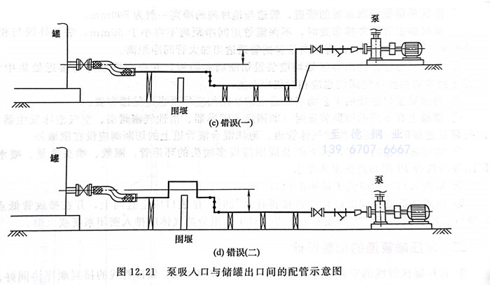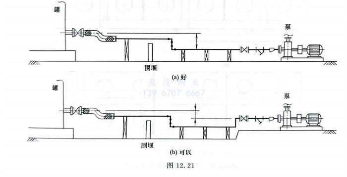 ⑦. 泵吸入口(kou)與儲罐出口(kou)間的配管應盡量縮短,不(bu)得有(you)上袋(dai)形(xing),盡量沒有(you)下袋(dai)形(xing),若(ruo)無法避免(mian)下袋(dai)形(xing)時(shi),泵入口(kou)配管中(zhong)心(xin)線不(bu)得高(gao)于儲罐管口(kou)中(zhong)心(xin)標高(gao),見圖12.21。