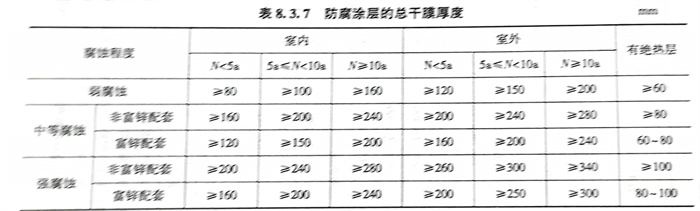 (7)防腐涂層的厚度(du)應根據腐蝕環境條件和設(she)計使用年(nian)限等因(yin)素確定。防腐涂層的總干(gan)膜厚度(du)可參考表8.3.7的規定。