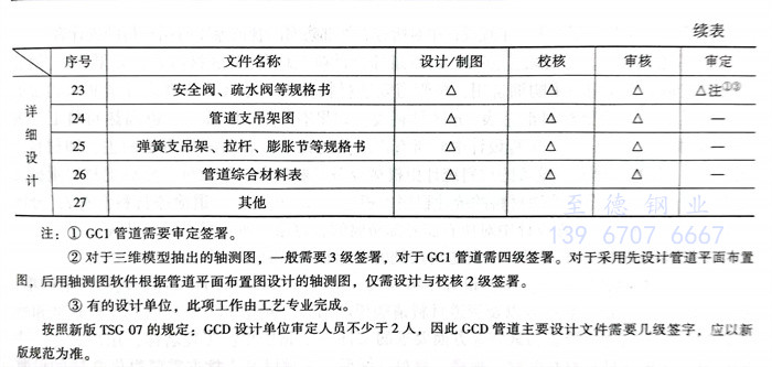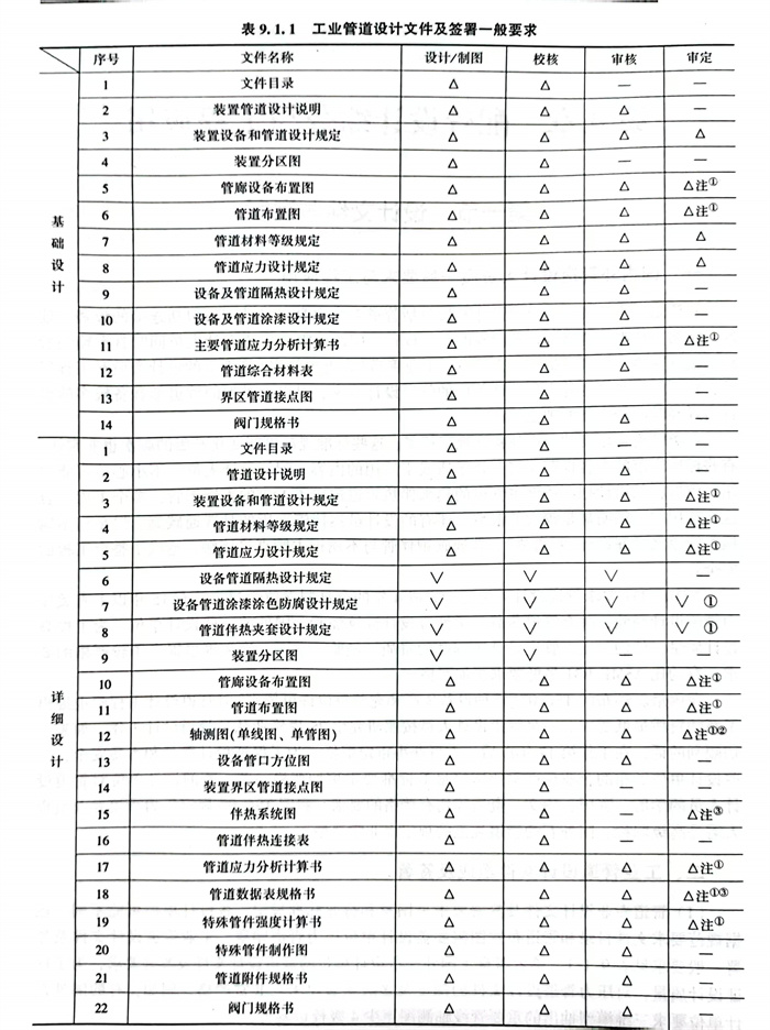 管(guan)道(dao)專業(ye)設(she)計(ji)(ji)文(wen)(wen)件(jian)及(ji)簽(qian)(qian)署(shu)要(yao)求見(jian)國家和(he)行業(ye)標準規(gui)定,各設(she)計(ji)(ji)單(dan)(dan)位可能不同。根據規(gui)范要(yao)求文(wen)(wen)件(jian)目錄和(he)管(guan)道(dao)布(bu)置圖需要(yao)蓋(gai)設(she)計(ji)(ji)單(dan)(dan)位壓(ya)力管(guan)道(dao)印章。工業(ye)管(guan)道(dao)設(she)計(ji)(ji)文(wen)(wen)件(jian)及(ji)簽(qian)(qian)署(shu)一(yi)般要(yao)求見(jian)表9.1.1。浙江至(zhi)德鋼業(ye)有限公(gong)司技術人員(yuan)考(kao)察了國外(wai)一(yi)些設(she)計(ji)(ji)單(dan)(dan)位的管(guan)道(dao)設(she)計(ji)(ji)文(wen)(wen)件(jian)及(ji)簽(qian)(qian)署(shu)要(yao)求,為了保證設(she)計(ji)(ji)質量,對壓(ya)力管(guan)道(dao)設(she)計(ji)(ji)文(wen)(wen)件(jian)的深度及(ji)多級簽(qian)(qian)署(shu)要(yao)求均(jun)非常嚴格,例如(ru),有的國外(wai)設(she)計(ji)(ji)單(dan)(dan)位要(yao)求三維模(mo)型抽(chou)出的重要(yao)管(guan)線軸測圖至(zhi)少4級校審(shen)簽(qian)(qian)署(shu)。