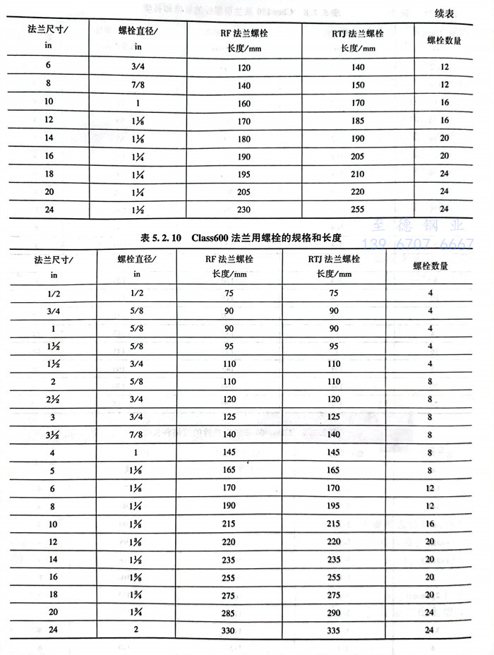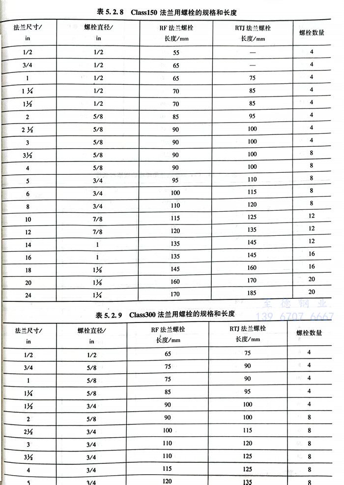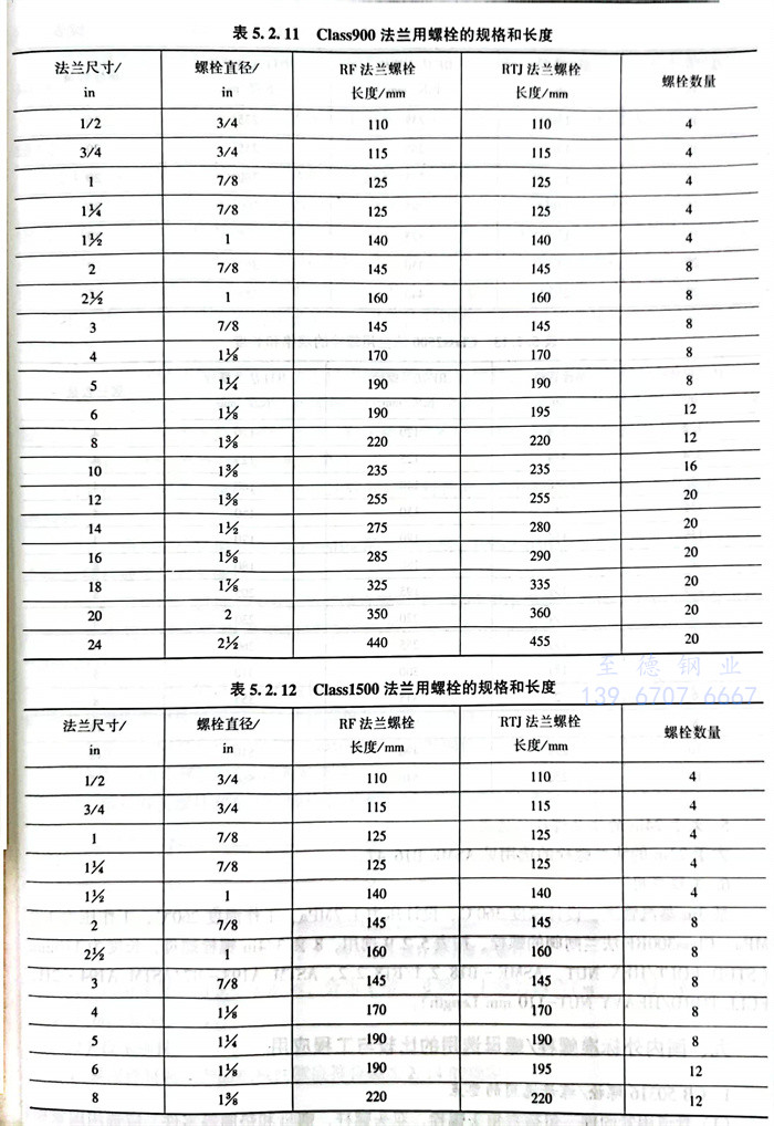 螺(luo)(luo)栓(shuan)(shuan)(shuan)長度(du)的(de)取值可從ASMEB16.5中的(de)推薦值來選擇,但是,還需要考慮螺(luo)(luo)栓(shuan)(shuan)(shuan)自(zi)身的(de)牙型、施(shi)工安裝位置、連接件長度(du)等因素。RF、RTJ法蘭用螺(luo)(luo)栓(shuan)(shuan)(shuan)的(de)規格(ge)和長度(du),Class150見(jian)表(biao)5.2.8,Class300見(jian)表(biao)5.2.9,Class600 見(jian)表(biao)5.2.10,Class900見(jian)表(biao)5.2.11,Class1500見(jian)表(biao)5.2.12,Class2500見(jian)表(biao)5.2.13。