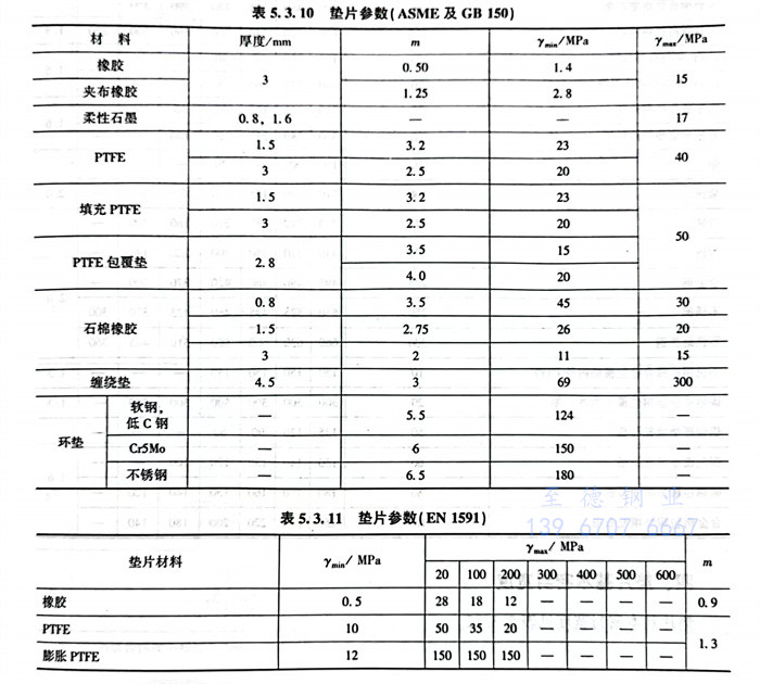墊片泄漏率是墊片密封性能的主要指標,各種墊片的泄漏率均按(GB 12358)《管法蘭用墊片密封性能試驗方法》測定。此方法同時可測定墊片的m、y值。非金屬和半金屬墊片的應力松弛率按GB/T 12621《管法蘭墊片應力松弛試驗方法》測得。這兩類墊片的壓縮率和回彈率按GB/T 12622《管法蘭墊片壓縮率及回彈率試驗方法》測定。此外,國標還規定了纏繞墊的試驗方法,見GB/T 14180。γ和m參數見表5.3.10和表5.3.11。