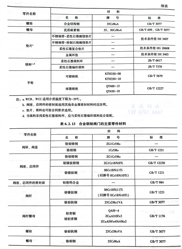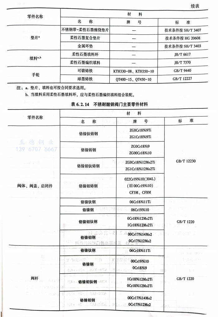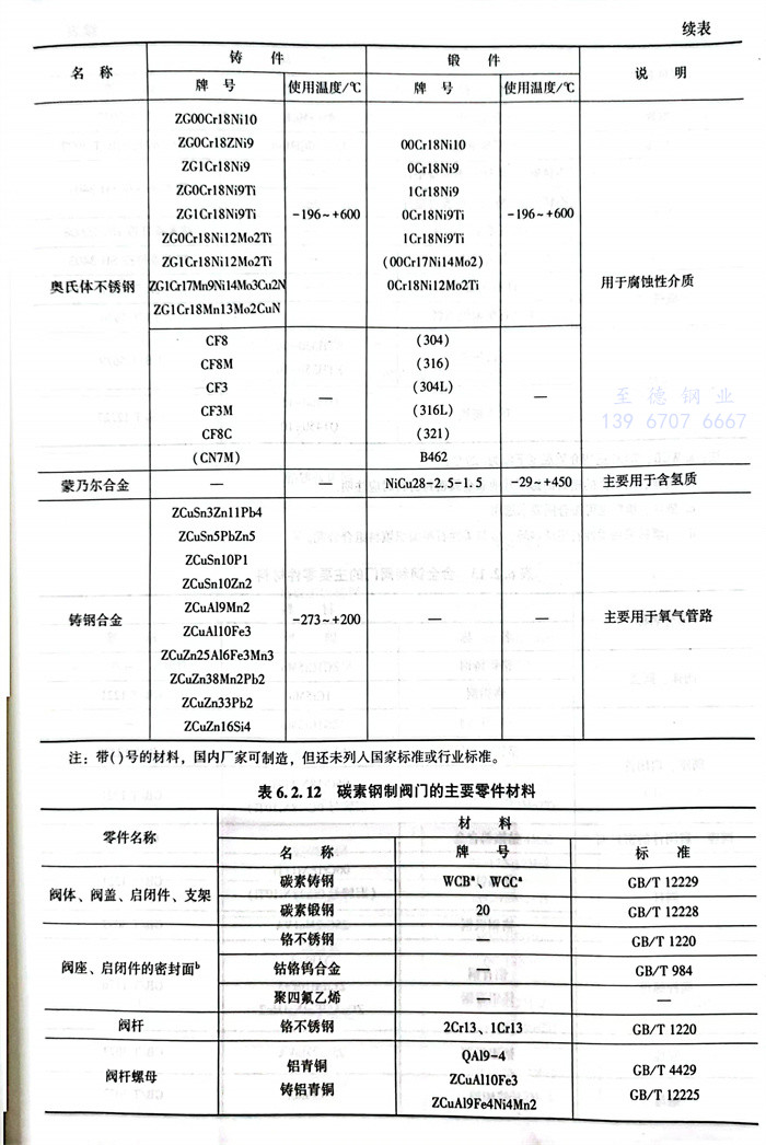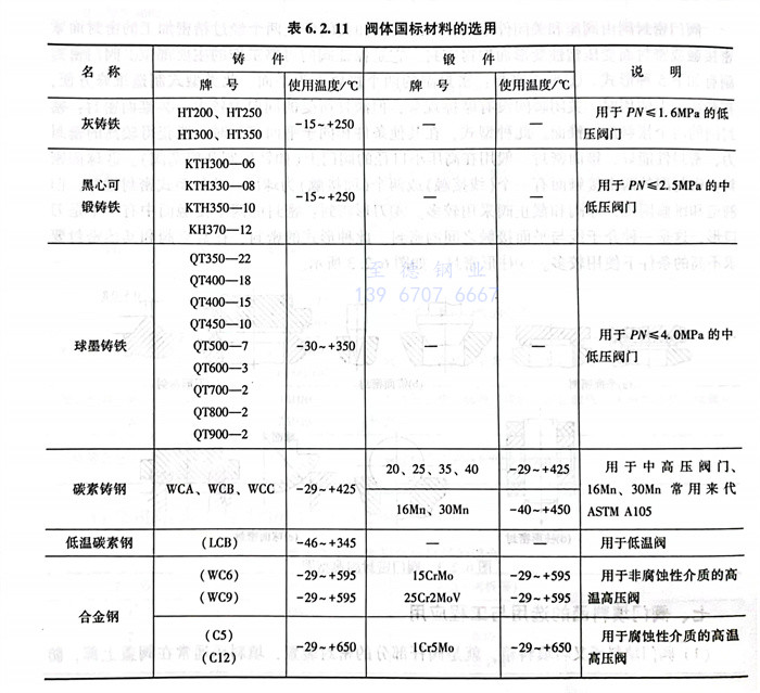 根據零件的結構尺寸、形狀決定采用鍛造或鑄造工藝。石油化工企業使用的通用閥門選用材料應執行行業標準SH/T 3064《石油化工鋼制通用閥門選用、檢驗及驗收》。國內標準閥門用材料的使用溫度范圍見表6.2.11。用于輸送介質溫度為-20~425℃碳素鋼制閥門的主要零件材料見表6.2.12。用于輸送介質溫度低于或等于550℃的合金鋼制閥門的主要零件材料見表6.2.13。用于輸送溫度低于或等于200℃的硝酸、醋酸的不(bu)銹(xiu)鋼(gang)制閥門主要零件材料見表6.2.14。