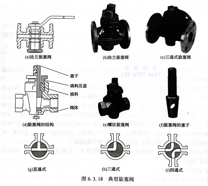 1. 旋(xuan)塞閥的啟(qi)閉件成柱(zhu)塞狀,通過旋(xuan)轉90℃使閥塞的接(jie)口與閥體接(jie)口相合或分開(kai)。旋(xuan)塞閥主要由閥體、塞子(zi)、填料(liao)壓蓋(gai)組成,見圖6.3.18(d)。