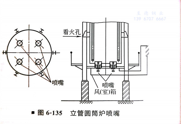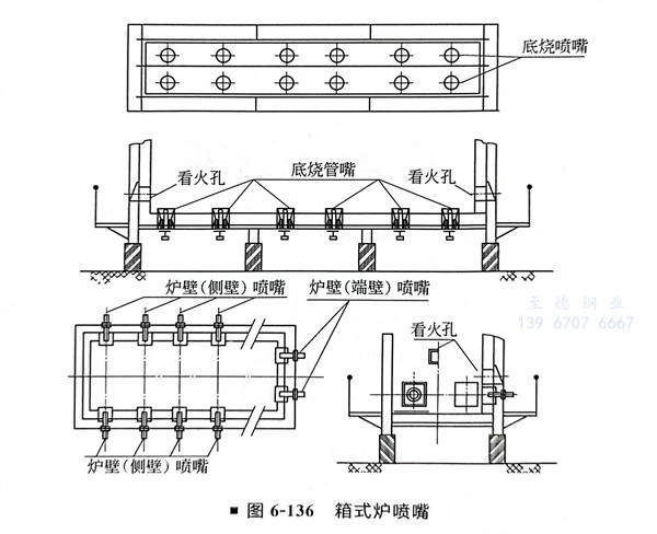 ②. 燃燒(shao)器一(yi)般設置在爐底(di)及側壁(底(di)燒(shao)噴(pen)(pen)嘴(zui)(zui)或側燒(shao)噴(pen)(pen)嘴(zui)(zui))。噴(pen)(pen)嘴(zui)(zui)數量(liang)及安裝位置取決(jue)于加(jia)熱爐的熱負荷(he)及爐體(ti)構造(圖(tu)6-135、圖(tu)6-136)。