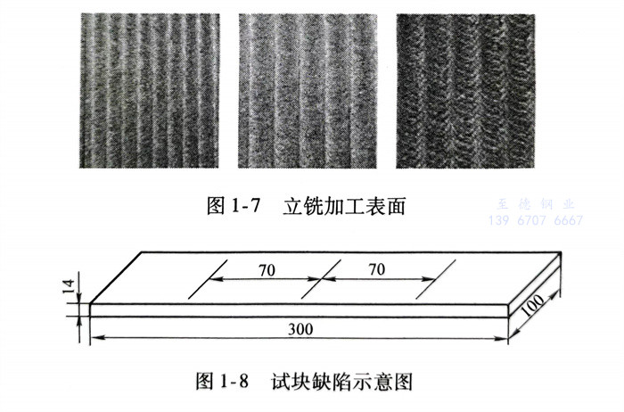 采用(yong)(yong)Q235碳素結構鋼制作試(shi)(shi)塊(kuai)(kuai)(kuai),試(shi)(shi)塊(kuai)(kuai)(kuai)尺寸(cun)長(chang)300mm、寬100mm、厚14mm。首先(xian),將三塊(kuai)(kuai)(kuai)試(shi)(shi)塊(kuai)(kuai)(kuai)表(biao)面(mian)利用(yong)(yong)飛刀進行銑削加工(gong)(gong),如(ru)圖1-6所(suo)示(shi),其表(biao)面(mian)粗(cu)糙度值從(cong)左(zuo)到右(you)依(yi)次為(wei)(wei)Ra3.2μm、Ra6.3μm、Ra12.5μm,編號(hao)1、2、3。然(ran)后,利用(yong)(yong)立銑加工(gong)(gong)另外三塊(kuai)(kuai)(kuai)試(shi)(shi)塊(kuai)(kuai)(kuai)表(biao)面(mian),如(ru)圖1-7所(suo)示(shi),其表(biao)面(mian)粗(cu)糙度值從(cong)左(zuo)到右(you)依(yi)次為(wei)(wei) Ra3.2μm、Ra6.3μm、Ra12.5μm,編號(hao)4、5、6。另外,再采用(yong)(yong)平(ping)磨加工(gong)(gong)一塊(kuai)(kuai)(kuai)試(shi)(shi)塊(kuai)(kuai)(kuai)表(biao)面(mian),此種方式獲得的表(biao)面(mian)質量較好,其表(biao)面(mian)粗(cu)糙度值為(wei)(wei)Ra0.2μm,編號(hao)7。所(suo)有試(shi)(shi)塊(kuai)(kuai)(kuai)表(biao)面(mian)均刻有一組(zu)寬度為(wei)(wei)20μm,深(shen)(shen)度不同的人(ren)工(gong)(gong)線狀(zhuang)缺陷,尺寸(cun)如(ru)圖1-8所(suo)示(shi),從(cong)左(zuo)到右(you)深(shen)(shen)度依(yi)次為(wei)(wei)20μm、45μm、70μm,相鄰(lin)缺陷的間距(ju)為(wei)(wei)70mm。