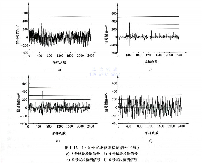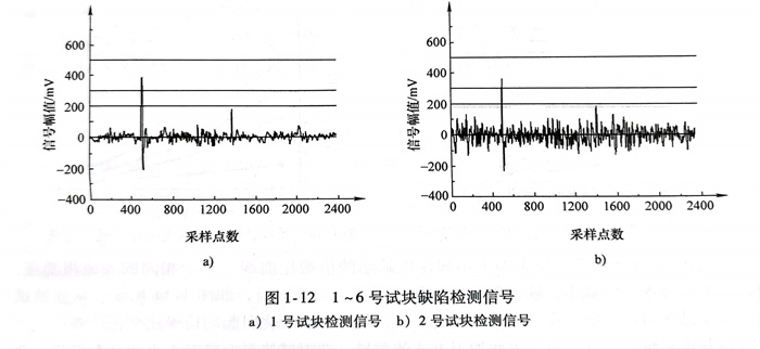 保持試驗條件(jian)不變,探頭(tou)以相(xiang)同(tong)速度掃(sao)查所(suo)有試塊,對不同(tong)深度的(de)(de)裂紋進行(xing)漏磁檢測。各試塊得到(dao)的(de)(de)缺陷檢測信號如圖1-12所(suo)示。