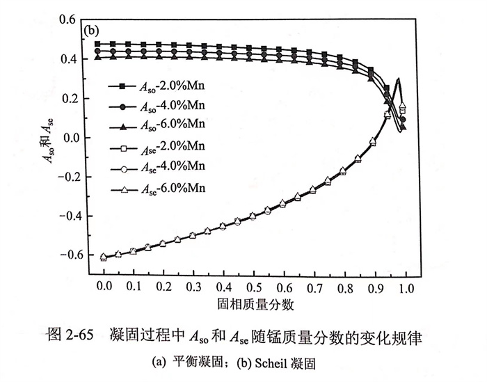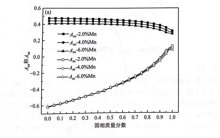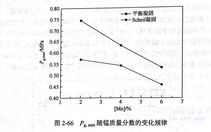 研究發現[19,25,95],部(bu)分(fen)(fen)合(he)(he)金元(yuan)(yuan)素(su)(su)(如錳和(he)鉻)能夠提高(gao)液相(xiang)(xiang)中氮(dan)(dan)的(de)(de)溶解(jie)(jie)度,減小Aso值(zhi);其中錳等合(he)(he)金元(yuan)(yuan)素(su)(su)在凝(ning)(ning)固(gu)過程中還(huan)能促進富氮(dan)(dan)相(xiang)(xiang)的(de)(de)形成(cheng)(cheng),減小枝晶間液相(xiang)(xiang)中氮(dan)(dan)的(de)(de)富集,緩解(jie)(jie)氮(dan)(dan)偏析,降(jiang)低Ase值(zhi)。如果(guo)合(he)(he)金元(yuan)(yuan)素(su)(su)能夠減小Aso與(yu)Ase的(de)(de)總和(he),那么(me)提高(gao)鋼(gang)(gang)中該(gai)合(he)(he)金元(yuan)(yuan)素(su)(su)的(de)(de)質量(liang)(liang)分(fen)(fen)數(shu)有助于抑制(zhi)(zhi)氮(dan)(dan)氣(qi)泡(pao)(pao)在殘余液相(xiang)(xiang)中形成(cheng)(cheng)。合(he)(he)金元(yuan)(yuan)素(su)(su)錳提高(gao)液相(xiang)(xiang)中氮(dan)(dan)質量(liang)(liang)分(fen)(fen)數(shu)的(de)(de)同時,還(huan)有助于富氮(dan)(dan)相(xiang)(xiang)(如奧氏體相(xiang)(xiang)γ和(he)hcp相(xiang)(xiang))在凝(ning)(ning)固(gu)過程中的(de)(de)形成(cheng)(cheng)。以21.5Cr5Mn1.5Ni0.25N含(han)氮(dan)(dan)雙(shuang)(shuang)相(xiang)(xiang)鋼(gang)(gang)D1鑄(zhu)錠為例,在平(ping)衡凝(ning)(ning)固(gu)和(he)Scheil凝(ning)(ning)固(gu)中,增加合(he)(he)金元(yuan)(yuan)素(su)(su)錳均能同時降(jiang)低Aso和(he)Ase的(de)(de)值(zhi),如圖(tu)2-65所示(shi)。與(yu)此(ci)同時,結(jie)合(he)(he)式(2-123),隨(sui)著合(he)(he)金元(yuan)(yuan)素(su)(su)錳質量(liang)(liang)分(fen)(fen)數(shu)增加而大(da)幅(fu)度減小,如圖(tu)2-66所示(shi)。因此(ci)增加鑄(zhu)錠中合(he)(he)金元(yuan)(yuan)素(su)(su)錳的(de)(de)質量(liang)(liang)分(fen)(fen)數(shu)有助于抑制(zhi)(zhi)液相(xiang)(xiang)中氮(dan)(dan)氣(qi)泡(pao)(pao)的(de)(de)形成(cheng)(cheng),減少或消(xiao)除21.5Cr5Mn1.5Ni0.25N 含(han)氮(dan)(dan)雙(shuang)(shuang)相(xiang)(xiang)鋼(gang)(gang)中氮(dan)(dan)氣(qi)孔(kong)缺陷(xian),該(gai)結(jie)論與(yu)Young等報(bao)道的(de)(de)一(yi)致。