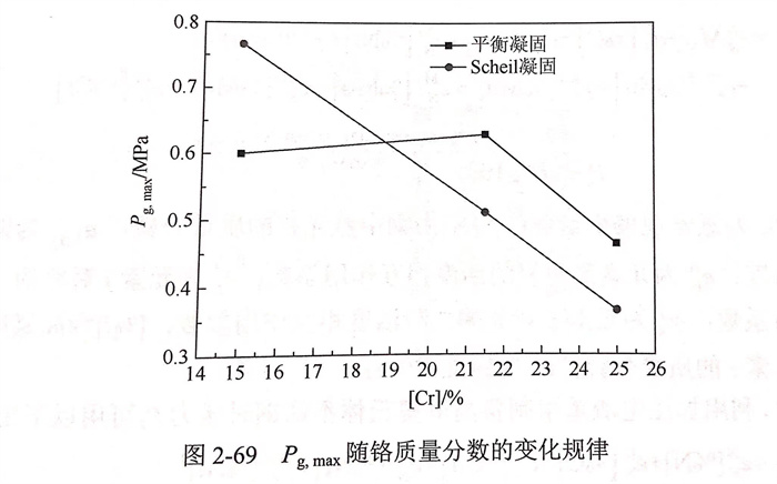 與合(he)(he)(he)金(jin)元(yuan)(yuan)(yuan)素(su)(su)(su)(su)(su)錳相比(bi),合(he)(he)(he)金(jin)元(yuan)(yuan)(yuan)素(su)(su)(su)(su)(su)鉻(ge)(ge)(ge)對(dui)(dui)氮(dan)氣孔形(xing)成(cheng)(cheng)的(de)(de)(de)(de)影響相對(dui)(dui)復(fu)雜。一(yi)方(fang)面(mian),增(zeng)加(jia)(jia)合(he)(he)(he)金(jin)元(yuan)(yuan)(yuan)素(su)(su)(su)(su)(su)鉻(ge)(ge)(ge)的(de)(de)(de)(de)質(zhi)量(liang)(liang)(liang)(liang)分(fen)數(shu)能提(ti)(ti)高液(ye)相中(zhong)氮(dan)的(de)(de)(de)(de)溶解度和(he)(he)(he)促進(jin)(jin)(jin)富氮(dan)相(hcp 相)在凝固過程中(zhong)的(de)(de)(de)(de)形(xing)成(cheng)(cheng)(圖(tu)2-67),減小(xiao)Aso的(de)(de)(de)(de)值,有(you)助于(yu)抑制液(ye)相中(zhong)氮(dan)氣泡的(de)(de)(de)(de)形(xing)成(cheng)(cheng)。以21.5Cr5Mn1.5Ni0.25N 含(han)氮(dan)雙相鋼D1鑄(zhu)錠為例,Aso隨鉻(ge)(ge)(ge)質(zhi)量(liang)(liang)(liang)(liang)分(fen)數(shu)的(de)(de)(de)(de)變化規(gui)律,如(ru)(ru)圖(tu)2-68所示。另(ling)一(yi)方(fang)面(mian),鉻(ge)(ge)(ge)作(zuo)為鐵素(su)(su)(su)(su)(su)體相8形(xing)成(cheng)(cheng)元(yuan)(yuan)(yuan)素(su)(su)(su)(su)(su),提(ti)(ti)高合(he)(he)(he)金(jin)元(yuan)(yuan)(yuan)素(su)(su)(su)(su)(su)鉻(ge)(ge)(ge)的(de)(de)(de)(de)質(zhi)量(liang)(liang)(liang)(liang)分(fen)數(shu)有(you)利于(yu)貧氮(dan)鐵素(su)(su)(su)(su)(su)體相8的(de)(de)(de)(de)形(xing)成(cheng)(cheng)(圖(tu)2-67),從而(er)加(jia)(jia)劇(ju)液(ye)相中(zhong)氮(dan)的(de)(de)(de)(de)富集,增(zeng)大(da)氮(dan)的(de)(de)(de)(de)偏析,增(zeng)加(jia)(jia)Ase(如(ru)(ru)圖(tu)2-68所示),對(dui)(dui)液(ye)相中(zhong)氮(dan)氣泡的(de)(de)(de)(de)形(xing)成(cheng)(cheng)具(ju)有(you)促進(jin)(jin)(jin)作(zuo)用。這種矛盾在平衡凝固過程中(zhong)較為突出,當合(he)(he)(he)金(jin)元(yuan)(yuan)(yuan)素(su)(su)(su)(su)(su)鉻(ge)(ge)(ge)的(de)(de)(de)(de)質(zhi)量(liang)(liang)(liang)(liang)分(fen)數(shu)從15%增(zeng)至21.5%時,由于(yu)Ase的(de)(de)(de)(de)增(zeng)量(liang)(liang)(liang)(liang)大(da)于(yu)Aso的(de)(de)(de)(de)減小(xiao)量(liang)(liang)(liang)(liang),Pg,max呈(cheng)現(xian)(xian)增(zeng)大(da)的(de)(de)(de)(de)趨勢,如(ru)(ru)圖(tu)2-69所示;當合(he)(he)(he)金(jin)元(yuan)(yuan)(yuan)素(su)(su)(su)(su)(su)鉻(ge)(ge)(ge)的(de)(de)(de)(de)質(zhi)量(liang)(liang)(liang)(liang)分(fen)數(shu)進(jin)(jin)(jin)一(yi)步(bu)增(zeng)加(jia)(jia)至25%時,Ase和(he)(he)(he)Aso分(fen)別增(zeng)大(da)和(he)(he)(he)減小(xiao),但(dan)與Ase相比(bi)Aso的(de)(de)(de)(de)變化量(liang)(liang)(liang)(liang)十分(fen)明(ming)顯,進(jin)(jin)(jin)而(er)導致Pg出現(xian)(xian)減小(xiao)的(de)(de)(de)(de)趨勢。然而(er),在Scheil凝固中(zhong),隨著合(he)(he)(he)金(jin)元(yuan)(yuan)(yuan)素(su)(su)(su)(su)(su)鉻(ge)(ge)(ge)質(zhi)量(liang)(liang)(liang)(liang)分(fen)數(shu)的(de)(de)(de)(de)提(ti)(ti)高,有(you)助于(yu)Aso大(da)幅度降低,Pg,max始終保持單(dan)調遞減的(de)(de)(de)(de)趨勢,如(ru)(ru)圖(tu)2-69所示。總(zong)之,隨著合(he)(he)(he)金(jin)元(yuan)(yuan)(yuan)素(su)(su)(su)(su)(su)鉻(ge)(ge)(ge)質(zhi)量(liang)(liang)(liang)(liang)分(fen)數(shu)的(de)(de)(de)(de)增(zeng)加(jia)(jia),Aso與Ase之和(he)(he)(he)的(de)(de)(de)(de)變化非單(dan)調,合(he)(he)(he)金(jin)元(yuan)(yuan)(yuan)素(su)(su)(su)(su)(su)鉻(ge)(ge)(ge)對(dui)(dui)液(ye)相中(zhong)氮(dan)氣泡形(xing)成(cheng)(cheng)的(de)(de)(de)(de)影響呈(cheng)現(xian)(xian)出雙面(mian)性(xing)(xing),同(tong)樣對(dui)(dui)鑄(zhu)錠內(nei)氣孔的(de)(de)(de)(de)形(xing)成(cheng)(cheng)也具(ju)有(you)雙面(mian)性(xing)(xing)。