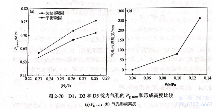 在(zai)鑄(zhu)錠凝固(gu)過程中,隨著初始(shi)氮(dan)質量(liang)分數的(de)(de)增(zeng)加(jia),氮(dan)在(zai)枝晶間殘余液相中的(de)(de)富集程度更(geng)加(jia)嚴重,[%N]1iq值更(geng)大。以21.5Cr5Mn1.5Ni0.25N含氮(dan)雙(shuang)相鋼(gang)為(wei)例,結合式(2-123)可得(de),Pg,max也隨之增(zeng)加(jia)。當初始(shi)氮(dan)質量(liang)分數從(cong)0.25%(D2)增(zeng)加(jia)至0.29%(D4)時,對平衡(heng)凝固(gu)和Scheil凝固(gu)而言,[%N]ig的(de)(de)最大值分別(bie)為(wei)1.03%和1.51%(圖2-51),Pg,max的(de)(de)增(zeng)量(liang)分別(bie)為(wei)0.07MPa和0.18MPa(如圖2-64所(suo)示)。由氣泡(pao)形成(cheng)時的(de)(de)壓(ya)力關(guan)系(xi)可知,P.,max的(de)(de)增(zeng)加(jia)意味著液相中氮(dan)氣泡(pao)形成(cheng)的(de)(de)概率(lv)增(zeng)大,表明增(zeng)加(jia)初始(shi)氮(dan)質量(liang)分數大幅度提高了鑄(zhu)錠內(nei)出現氮(dan)氣孔缺(que)陷的(de)(de)可能性。
