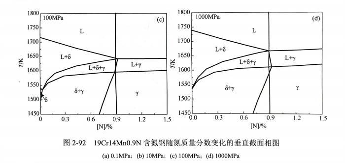 19Cr14Mn0.9N含(han)氮鋼凝(ning)固過程中(zhong)(zhong)鐵(tie)素(su)體(ti)(ti)(ti)相(xiang)(xiang)8和奧氏體(ti)(ti)(ti)相(xiang)(xiang)γ的單相(xiang)(xiang)區(qu)隨(sui)壓力(li)的變(bian)化(hua)規律如(ru)圖(tu)2-95所(suo)示。當壓力(li)從(cong)0.1MPa增(zeng)(zeng)(zeng)加(jia)到100MPa時(shi),δ/(δ+L)相(xiang)(xiang)邊(bian)界(jie)(jie)(jie)變(bian)化(hua)較小,8/(δ+γ)相(xiang)(xiang)邊(bian)界(jie)(jie)(jie)整(zheng)體(ti)(ti)(ti)向高(gao)溫(wen)端移動,鐵(tie)素(su)體(ti)(ti)(ti)相(xiang)(xiang)8形成區(qu)域(yu)逐(zhu)漸減小;當壓力(li)進一步增(zeng)(zeng)(zeng)加(jia)到1000MPa時(shi),鐵(tie)素(su)體(ti)(ti)(ti)相(xiang)(xiang)8單相(xiang)(xiang)區(qu)幾乎從(cong)隨(sui)氮質(zhi)量分數變(bian)化(hua)的垂直截面(mian)相(xiang)(xiang)圖(tu)中(zhong)(zhong)消失,如(ru)圖(tu)2-95(a)所(suo)示,即增(zeng)(zeng)(zeng)加(jia)壓力(li)有(you)助于鐵(tie)素(su)體(ti)(ti)(ti)相(xiang)(xiang)δ的消失[138].而(er)對于奧氏體(ti)(ti)(ti)相(xiang)(xiang)γ,隨(sui)著壓力(li)的增(zeng)(zeng)(zeng)加(jia),γ/(y+L)相(xiang)(xiang)邊(bian)界(jie)(jie)(jie)向高(gao)溫(wen)段(duan)移動,γ/(δ+γ)相(xiang)(xiang)邊(bian)界(jie)(jie)(jie)整(zheng)體(ti)(ti)(ti)向高(gao)氮區(qu)移動,整(zheng)個區(qu)域(yu)呈增(zeng)(zeng)(zeng)大趨(qu)勢,如(ru)圖(tu)2-95(b)所(suo)示。