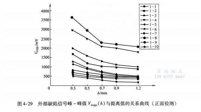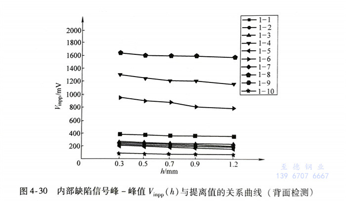 從圖4-29和(he)圖4-30中可以看出,在不同提離(li)(li)值(zhi)下,Vexpp(和(he)Vimpp(h))的(de)變化趨勢僅在一(yi)定區(qu)域具有(you)明顯差(cha)異。在此區(qu)域,外部缺陷(xian)(xian)檢(jian)測信號(hao)峰-峰值(zhi)Vexpp(h)隨(sui)提離(li)(li)值(zhi)的(de)增加劇烈減(jian)小,而內部缺陷(xian)(xian)檢(jian)測信號(hao)峰-峰值(zhi)Vinpp(h))的(de)變化程度相對緩慢。