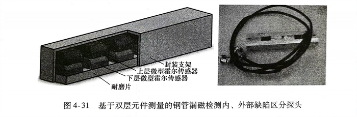 進(jin)一(yi)步,試(shi)驗(yan)驗(yan)證(zheng)將歸一(yi)化(hua)衰減率作為不銹鋼管(guan)內、外部缺(que)陷(xian)區分標(biao)準(zhun)的可行(xing)性,設(she)計雙層霍(huo)爾(er)元件(jian)陣列封(feng)裝檢(jian)測探頭,結構及實物如圖4-31所示。采用(yong)(yong)厚度(du)(du)為0.3mm的聚甲(jia)醛片作為耐磨(mo)片,微型(xing)霍(huo)爾(er)元件(jian)厚度(du)(du)為0.4mm,最終形成雙層霍(huo)爾(er)元件(jian)相(xiang)對于不銹鋼管(guan)表面提離距離分別為0.3mm和0.7mm。選用(yong)(yong)厚度(du)(du)為9.35mm、外徑為88.9mm的鋼管(guan)作為試(shi)件(jian),采用(yong)(yong)電火(huo)花及機械(xie)加工方法在不銹鋼管(guan)上加工內、外部缺(que)陷(xian),見(jian)表4-16,采用(yong)(yong)直流磁(ci)化(hua)線圈(quan)對鋼管(guan)進(jin)行(xing)軸向磁(ci)化(hua),檢(jian)測速度(du)(du)保持穩定。