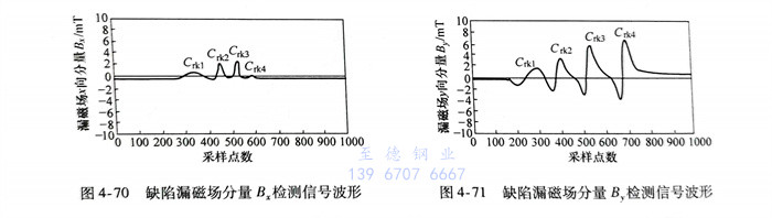 磁化電流設置(zhi)為(wei)(wei)5A且(qie)傳感器提離值為(wei)(wei)1.0mm。將鋼板以恒定速度0.5m/s通過(guo)檢測(ce)系統,使傳感器依次掃查缺陷(xian)Crk1、Ck2、Ck3和Crk4,并分別(bie)記錄漏磁場(chang)x、y、z軸分量檢測(ce)信號,如圖 4-70~圖 4-72所示。