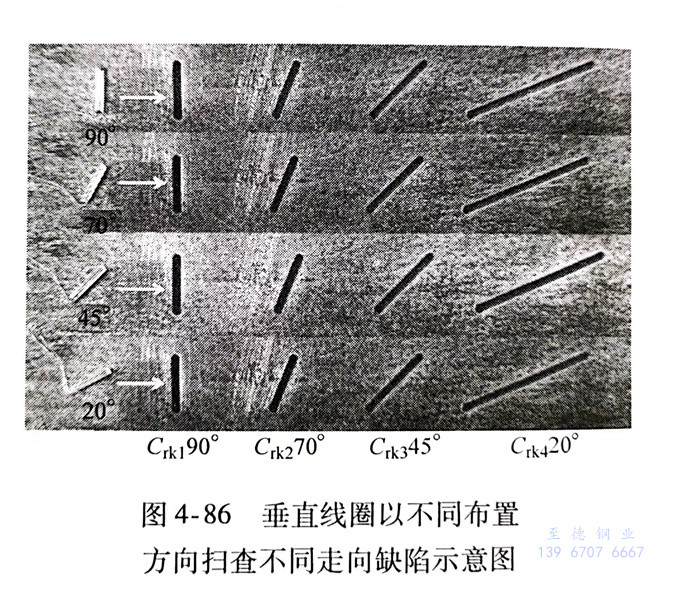 在(zai)實際生(sheng)產過(guo)(guo)程(cheng)中(zhong)(zhong),當(dang)生(sheng)產工藝參(can)數確(que)定后,同批(pi)鋼管中(zhong)(zhong)自然缺(que)(que)陷(xian)(xian)走(zou)(zou)向(xiang)(xiang)(xiang)(xiang)(xiang)往往大致相同。如(ru)(ru)圖4-89所示,設鋼管中(zhong)(zhong)存在(zai)斜(xie)向(xiang)(xiang)(xiang)(xiang)(xiang)缺(que)(que)陷(xian)(xian)1,并與磁(ci)化(hua)場(chang)(chang)方(fang)(fang)向(xiang)(xiang)(xiang)(xiang)(xiang)形(xing)成(cheng)夾(jia)角ao,由于在(zai)物料運(yun)輸過(guo)(guo)程(cheng)中(zhong)(zhong)可能出(chu)現鋼管方(fang)(fang)向(xiang)(xiang)(xiang)(xiang)(xiang)倒置(zhi),因(yin)此,斜(xie)向(xiang)(xiang)(xiang)(xiang)(xiang)缺(que)(que)陷(xian)(xian)走(zou)(zou)向(xiang)(xiang)(xiang)(xiang)(xiang)也可能會(hui)與磁(ci)化(hua)場(chang)(chang)方(fang)(fang)向(xiang)(xiang)(xiang)(xiang)(xiang)形(xing)成(cheng)夾(jia)角ππ-α0,如(ru)(ru)斜(xie)向(xiang)(xiang)(xiang)(xiang)(xiang)缺(que)(que)陷(xian)(xian)3。對(dui)此,在(zai)探(tan)頭內部布置(zhi)多(duo)向(xiang)(xiang)(xiang)(xiang)(xiang)性陣列(lie)感(gan)(gan)應(ying)(ying)線(xian)(xian)圈(quan)(quan)(quan)S1、S2和S3,分別(bie)與磁(ci)化(hua)場(chang)(chang)形(xing)成(cheng)夾(jia)角a1、α2和α3其中(zhong)(zhong),第一排(pai)陣列(lie)感(gan)(gan)應(ying)(ying)線(xian)(xian)圈(quan)(quan)(quan)S,對(dui)斜(xie)向(xiang)(xiang)(xiang)(xiang)(xiang)缺(que)(que)陷(xian)(xian)1進行掃查,根據水平(ping)(ping)線(xian)(xian)圈(quan)(quan)(quan)敏(min)感(gan)(gan)方(fang)(fang)向(xiang)(xiang)(xiang)(xiang)(xiang)與缺(que)(que)陷(xian)(xian)走(zou)(zou)向(xiang)(xiang)(xiang)(xiang)(xiang)夾(jia)角對(dui)檢(jian)測(ce)信號(hao)幅值(zhi)的影響規律,線(xian)(xian)圈(quan)(quan)(quan)敏(min)感(gan)(gan)方(fang)(fang)向(xiang)(xiang)(xiang)(xiang)(xiang)應(ying)(ying)該與缺(que)(que)陷(xian)(xian)1走(zou)(zou)向(xiang)(xiang)(xiang)(xiang)(xiang)平(ping)(ping)行,即α1=α0;第二排(pai)陣列(lie)感(gan)(gan)應(ying)(ying)線(xian)(xian)圈(quan)(quan)(quan)S2用于檢(jian)測(ce)標準(zhun)垂直缺(que)(que)陷(xian)(xian)2和校驗(yan)設備狀態,因(yin)此線(xian)(xian)圈(quan)(quan)(quan)敏(min)感(gan)(gan)方(fang)(fang)向(xiang)(xiang)(xiang)(xiang)(xiang)與磁(ci)化(hua)方(fang)(fang)向(xiang)(xiang)(xiang)(xiang)(xiang)垂直,即a2=90°第三排(pai)陣列(lie)感(gan)(gan)應(ying)(ying)線(xian)(xian)圈(quan)(quan)(quan)S3方(fang)(fang)向(xiang)(xiang)(xiang)(xiang)(xiang)與缺(que)(que)陷(xian)(xian)3走(zou)(zou)向(xiang)(xiang)(xiang)(xiang)(xiang)平(ping)(ping)行,即α3=π-α0。