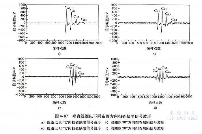 從圖4-87中(zhong)可以看出,當(dang)垂(chui)(chui)直線(xian)圈(quan)(quan)(quan)以不同布置方(fang)(fang)向掃查(cha)四(si)(si)(si)個(ge)(ge)缺(que)(que)陷(xian)(xian)(xian)(xian)時(shi),檢測(ce)信(xin)(xin)號(hao)(hao)(hao)(hao)變化(hua)規律與水(shui)平線(xian)圈(quan)(quan)(quan)相同:當(dang)垂(chui)(chui)直線(xian)圈(quan)(quan)(quan)以90°方(fang)(fang)向依(yi)(yi)次(ci)(ci)掃過四(si)(si)(si)個(ge)(ge)缺(que)(que)陷(xian)(xian)(xian)(xian)時(shi),檢測(ce)信(xin)(xin)號(hao)(hao)(hao)(hao)依(yi)(yi)次(ci)(ci)減小,其(qi)中(zhong)C,k1缺(que)(que)陷(xian)(xian)(xian)(xian)信(xin)(xin)號(hao)(hao)(hao)(hao)幅(fu)(fu)值(zhi)(zhi)最(zui)(zui)大(da),C4缺(que)(que)陷(xian)(xian)(xian)(xian)信(xin)(xin)號(hao)(hao)(hao)(hao)幅(fu)(fu)值(zhi)(zhi)最(zui)(zui)小;當(dang)垂(chui)(chui)直線(xian)圈(quan)(quan)(quan)以70°方(fang)(fang)向依(yi)(yi)次(ci)(ci)掃過四(si)(si)(si)個(ge)(ge)缺(que)(que)陷(xian)(xian)(xian)(xian)時(shi),缺(que)(que)陷(xian)(xian)(xian)(xian)信(xin)(xin)號(hao)(hao)(hao)(hao)幅(fu)(fu)值(zhi)(zhi)最(zui)(zui)大(da),C信(xin)(xin)號(hao)(hao)(hao)(hao)幅(fu)(fu)值(zhi)(zhi)次(ci)(ci)之,然后依(yi)(yi)次(ci)(ci)為Ck3和C4k4;當(dang)垂(chui)(chui)直線(xian)圈(quan)(quan)(quan)以45°方(fang)(fang)向依(yi)(yi)次(ci)(ci)掃過四(si)(si)(si)個(ge)(ge)缺(que)(que)陷(xian)(xian)(xian)(xian)時(shi),C,k3缺(que)(que)陷(xian)(xian)(xian)(xian)信(xin)(xin)號(hao)(hao)(hao)(hao)幅(fu)(fu)值(zhi)(zhi)明顯增加,C,k4信(xin)(xin)號(hao)(hao)(hao)(hao)幅(fu)(fu)值(zhi)(zhi)有所增加,而Ck1和Ck2信(xin)(xin)號(hao)(hao)(hao)(hao)幅(fu)(fu)值(zhi)(zhi)均降低;當(dang)垂(chui)(chui)直線(xian)圈(quan)(quan)(quan)以20°方(fang)(fang)向依(yi)(yi)次(ci)(ci)掃過四(si)(si)(si)個(ge)(ge)缺(que)(que)陷(xian)(xian)(xian)(xian)時(shi),Crk4缺(que)(que)陷(xian)(xian)(xian)(xian)信(xin)(xin)號(hao)(hao)(hao)(hao)幅(fu)(fu)值(zhi)(zhi)增加,其(qi)余三個(ge)(ge)缺(que)(que)陷(xian)(xian)(xian)(xian)信(xin)(xin)號(hao)(hao)(hao)(hao)幅(fu)(fu)值(zhi)(zhi)都降低,而且Ck1、Crk2和Crk3信(xin)(xin)號(hao)(hao)(hao)(hao)幅(fu)(fu)值(zhi)(zhi)依(yi)(yi)次(ci)(ci)由小到大(da)排列。