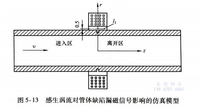 隨著不(bu)銹鋼(gang)(gang)管(guan)(guan)(guan)的(de)進一步(bu)深(shen)入(ru)磁(ci)(ci)(ci)(ci)(ci)(ci)化(hua)線圈(quan),鋼(gang)(gang)管(guan)(guan)(guan)管(guan)(guan)(guan)體與軸向(xiang)磁(ci)(ci)(ci)(ci)(ci)(ci)化(hua)場(chang)耦(ou)合。由于磁(ci)(ci)(ci)(ci)(ci)(ci)化(hua)線圈(quan)內部(bu)磁(ci)(ci)(ci)(ci)(ci)(ci)介質總(zong)量基(ji)(ji)本(ben)不(bu)變,磁(ci)(ci)(ci)(ci)(ci)(ci)化(hua)線圈(quan)磁(ci)(ci)(ci)(ci)(ci)(ci)通總(zong)量也(ye)基(ji)(ji)本(ben)保持不(bu)變,因此磁(ci)(ci)(ci)(ci)(ci)(ci)化(hua)線圈(quan)內部(bu)基(ji)(ji)本(ben)無感(gan)生(sheng)電(dian)流(liu)(liu)(liu)(liu)產生(sheng)。此時產生(sheng)磁(ci)(ci)(ci)(ci)(ci)(ci)場(chang)的(de)電(dian)流(liu)(liu)(liu)(liu)源主要包(bao)括原(yuan)始磁(ci)(ci)(ci)(ci)(ci)(ci)化(hua)電(dian)流(liu)(liu)(liu)(liu)I6和鋼(gang)(gang)管(guan)(guan)(guan)中的(de)感(gan)生(sheng)渦(wo)流(liu)(liu)(liu)(liu)J。在進入(ru)區,鋼(gang)(gang)管(guan)(guan)(guan)中形(xing)成(cheng)與原(yuan)始磁(ci)(ci)(ci)(ci)(ci)(ci)化(hua)電(dian)流(liu)(liu)(liu)(liu)1。方(fang)向(xiang)相(xiang)(xiang)反(fan)的(de)感(gan)生(sheng)渦(wo)流(liu)(liu)(liu)(liu)J1;在離開區,鋼(gang)(gang)管(guan)(guan)(guan)中形(xing)成(cheng)與原(yuan)始磁(ci)(ci)(ci)(ci)(ci)(ci)化(hua)電(dian)流(liu)(liu)(liu)(liu)16方(fang)向(xiang)相(xiang)(xiang)同的(de)感(gan)生(sheng)渦(wo)流(liu)(liu)(liu)(liu)J2,最終,可獲得鋼(gang)(gang)管(guan)(guan)(guan)管(guan)(guan)(guan)體處(chu)磁(ci)(ci)(ci)(ci)(ci)(ci)場(chang)的(de)總(zong)體分(fen)布(bu),如圖5-15b所(suo)示(shi)。從圖中可以看(kan)出,進入(ru)區感(gan)生(sheng)渦(wo)流(liu)(liu)(liu)(liu)磁(ci)(ci)(ci)(ci)(ci)(ci)場(chang)H與原(yuan)始磁(ci)(ci)(ci)(ci)(ci)(ci)化(hua)場(chang)Ho方(fang)向(xiang)相(xiang)(xiang)反(fan),而(er)離開區感(gan)生(sheng)渦(wo)流(liu)(liu)(liu)(liu)磁(ci)(ci)(ci)(ci)(ci)(ci)場(chang)H2J與原(yuan)始磁(ci)(ci)(ci)(ci)(ci)(ci)化(hua)場(chang)方(fang)向(xiang)相(xiang)(xiang)同,此時,總(zong)磁(ci)(ci)(ci)(ci)(ci)(ci)化(hua)場(chang)H為
