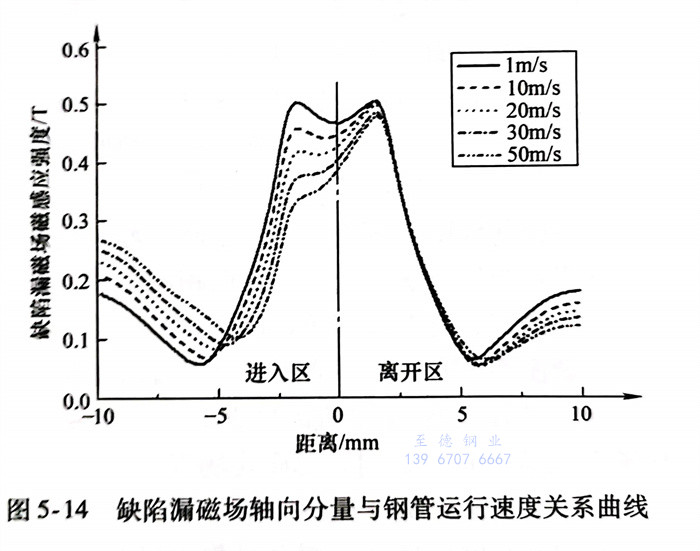 從圖5-14中可以(yi)看出,隨著(zhu)鋼管運行速度的(de)不斷提(ti)(ti)高,缺陷漏(lou)磁場(chang)(chang)軸向(xiang)分量中心(xin)幅值不斷降低,并且(qie)離(li)(li)開(kai)(kai)區(qu)的(de)漏(lou)磁場(chang)(chang)強度大(da)于進(jin)入(ru)區(qu)。究其原因,由于鋼管中存在不同(tong)方向(xiang)的(de)感生(sheng)渦流,導致離(li)(li)開(kai)(kai)區(qu)磁場(chang)(chang)強度大(da)于進(jin)入(ru)區(qu)磁場(chang)(chang)強度。并且(qie),隨著(zhu)檢測(ce)速度的(de)不斷提(ti)(ti)高,磁化(hua)場(chang)(chang)對稱中心(xin)逐漸移(yi)至離(li)(li)開(kai)(kai)區(qu)內(nei)。