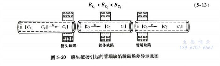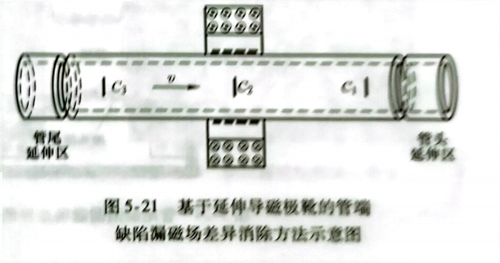 感(gan)(gan)生(sheng)(sheng)(sheng)(sheng)磁(ci)(ci)(ci)場(chang)(chang)(chang)(chang)(chang)會引(yin)起鋼(gang)管(guan)(guan)(guan)(guan)(guan)管(guan)(guan)(guan)(guan)(guan)端(duan)(duan)(duan)磁(ci)(ci)(ci)化狀態發(fa)生(sheng)(sheng)(sheng)(sheng)變化,進(jin)一步導致位(wei)于(yu)鋼(gang)管(guan)(guan)(guan)(guan)(guan)管(guan)(guan)(guan)(guan)(guan)頭(tou)、管(guan)(guan)(guan)(guan)(guan)體(ti)(ti)(ti)和(he)管(guan)(guan)(guan)(guan)(guan)尾的(de)具有相(xiang)同尺寸的(de)缺(que)陷(xian)(xian)產生(sheng)(sheng)(sheng)(sheng)不同的(de)漏磁(ci)(ci)(ci)場(chang)(chang)(chang)(chang)(chang)強度(du)。如圖(tu)(tu)5-20所示,在感(gan)(gan)生(sheng)(sheng)(sheng)(sheng)磁(ci)(ci)(ci)場(chang)(chang)(chang)(chang)(chang)的(de)作用下,位(wei)于(yu)鋼(gang)管(guan)(guan)(guan)(guan)(guan)管(guan)(guan)(guan)(guan)(guan)頭(tou)、管(guan)(guan)(guan)(guan)(guan)體(ti)(ti)(ti)和(he)管(guan)(guan)(guan)(guan)(guan)尾處(chu)的(de)缺(que)陷(xian)(xian)C1C2和(he)C3產產生(sheng)(sheng)(sheng)(sheng)的(de)漏磁(ci)(ci)(ci)場(chang)(chang)(chang)(chang)(chang)Bc1、Bc2和(he)Bc3的(de)強度(du)依次增大(da),為消(xiao)(xiao)除感(gan)(gan)生(sheng)(sheng)(sheng)(sheng)磁(ci)(ci)(ci)場(chang)(chang)(chang)(chang)(chang)引(yin)起的(de)管(guan)(guan)(guan)(guan)(guan)端(duan)(duan)(duan)漏磁(ci)(ci)(ci)場(chang)(chang)(chang)(chang)(chang)差(cha)異,將(jiang)感(gan)(gan)生(sheng)(sheng)(sheng)(sheng)磁(ci)(ci)(ci)場(chang)(chang)(chang)(chang)(chang)的(de)影響(xiang)由(you)鋼(gang)管(guan)(guan)(guan)(guan)(guan)本體(ti)(ti)(ti)轉移到延(yan)伸(shen)區(qu)(qu)(qu)內(nei)。如圖(tu)(tu)5-21所示,在鋼(gang)管(guan)(guan)(guan)(guan)(guan)端(duan)(duan)(duan)部(bu)補充(chong)鐵磁(ci)(ci)(ci)性物質(zhi),使鋼(gang)管(guan)(guan)(guan)(guan)(guan)整(zheng)體(ti)(ti)(ti)長度(du)向(xiang)兩端(duan)(duan)(duan)延(yan)伸(shen),從而在端(duan)(duan)(duan)部(bu)發(fa)生(sheng)(sheng)(sheng)(sheng)的(de)電(dian)磁(ci)(ci)(ci)感(gan)(gan)應(ying)現象(xiang)將(jiang)轉移到延(yan)伸(shen)區(qu)(qu)(qu)內(nei)。由(you)于(yu)延(yan)伸(shen)區(qu)(qu)(qu)的(de)存在,當鋼(gang)管(guan)(guan)(guan)(guan)(guan)端(duan)(duan)(duan)部(bu)進(jin)入和(he)離開(kai)磁(ci)(ci)(ci)化線(xian)圈時,磁(ci)(ci)(ci)化線(xian)圈內(nei)部(bu)磁(ci)(ci)(ci)介質(zhi)總量已基本進(jin)入穩定狀態,線(xian)圈磁(ci)(ci)(ci)通量保持恒(heng)定而不會產生(sheng)(sheng)(sheng)(sheng)感(gan)(gan)生(sheng)(sheng)(sheng)(sheng)電(dian)流(liu);由(you)于(yu)在鋼(gang)管(guan)(guan)(guan)(guan)(guan)進(jin)入區(qu)(qu)(qu)和(he)離開(kai)區(qu)(qu)(qu)同時產生(sheng)(sheng)(sheng)(sheng)反(fan)向(xiang)的(de)感(gan)(gan)生(sheng)(sheng)(sheng)(sheng)渦(wo)流(liu)磁(ci)(ci)(ci)場(chang)(chang)(chang)(chang)(chang),從而減弱了(le)單(dan)一方向(xiang)感(gan)(gan)生(sheng)(sheng)(sheng)(sheng)渦(wo)流(liu)磁(ci)(ci)(ci)場(chang)(chang)(chang)(chang)(chang)的(de)劇烈影響(xiang)。將(jiang)鋼(gang)管(guan)(guan)(guan)(guan)(guan)端(duan)(duan)(duan)部(bu)進(jin)行延(yan)伸(shen)之后,管(guan)(guan)(guan)(guan)(guan)端(duan)(duan)(duan)缺(que)陷(xian)(xian)漏磁(ci)(ci)(ci)場(chang)(chang)(chang)(chang)(chang)差(cha)異與管(guan)(guan)(guan)(guan)(guan)體(ti)(ti)(ti)相(xiang)似,僅存在鋼(gang)管(guan)(guan)(guan)(guan)(guan)進(jin)入區(qu)(qu)(qu)和(he)離開(kai)區(qu)(qu)(qu)產生(sheng)(sheng)(sheng)(sheng)的(de)感(gan)(gan)生(sheng)(sheng)(sheng)(sheng)渦(wo)流(liu)磁(ci)(ci)(ci)場(chang)(chang)(chang)(chang)(chang),因此可(ke)采(cai)用管(guan)(guan)(guan)(guan)(guan)體(ti)(ti)(ti)缺(que)陷(xian)(xian)漏磁(ci)(ci)(ci)場(chang)(chang)(chang)(chang)(chang)差(cha)異消(xiao)(xiao)除方法進(jin)一步處(chu)理。