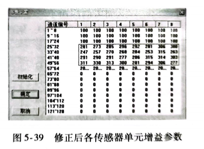 為消(xiao)除感(gan)生(sheng)磁場(chang)(chang)引起的(de)管(guan)體同尺寸(cun)缺(que)陷漏(lou)磁場(chang)(chang)差(cha)異,以圓環作(zuo)為標(biao)定(ding)信(xin)號(hao)(hao)(hao)(hao)源對陣列傳感(gan)單元增益(yi)進行修正(zheng),樣管(guan)如(ru)圖(tu)(tu)(tu)(tu)(tu)5-36所(suo)(suo)示(shi)。檢測(ce)信(xin)號(hao)(hao)(hao)(hao)系統共32個(ge)(ge)通(tong)(tong)道(dao),初始采集時(shi)各通(tong)(tong)道(dao)增益(yi)統一(yi)設(she)置為200,如(ru)圖(tu)(tu)(tu)(tu)(tu)5-37所(suo)(suo)示(shi)。當樣管(guan)以速(su)(su)度1.0m/s通(tong)(tong)過檢測(ce)探(tan)頭時(shi),獲(huo)得(de)(de)(de)編號(hao)(hao)(hao)(hao)25~32八個(ge)(ge)通(tong)(tong)道(dao)缺(que)陷漏(lou)磁信(xin)號(hao)(hao)(hao)(hao)波形,如(ru)圖(tu)(tu)(tu)(tu)(tu)5-38所(suo)(suo)示(shi),其中每一(yi)條(tiao)(tiao)曲線(xian)代表一(yi)個(ge)(ge)通(tong)(tong)道(dao)。從(cong)圖(tu)(tu)(tu)(tu)(tu)中可(ke)以看(kan)出(chu),標(biao)定(ding)圓環在(zai)各傳感(gan)單元中產(chan)生(sheng)的(de)漏(lou)磁信(xin)號(hao)(hao)(hao)(hao)幅(fu)(fu)值不(bu)同。進一(yi)步,將目標(biao)信(xin)號(hao)(hao)(hao)(hao)幅(fu)(fu)值Vs設(she)置為90,根據(ju)式(5-12)算法獲(huo)得(de)(de)(de)各通(tong)(tong)道(dao)的(de)修正(zheng)參數(shu),如(ru)圖(tu)(tu)(tu)(tu)(tu)5-39所(suo)(suo)示(shi)。將標(biao)定(ding)圓環再次以相(xiang)同速(su)(su)度通(tong)(tong)過橫向檢測(ce)系統時(shi)獲(huo)得(de)(de)(de)如(ru)圖(tu)(tu)(tu)(tu)(tu)5-40所(suo)(suo)示(shi)的(de)檢測(ce)信(xin)號(hao)(hao)(hao)(hao),其中一(yi)條(tiao)(tiao)曲線(xian)為一(yi)個(ge)(ge)通(tong)(tong)道(dao)。從(cong)圖(tu)(tu)(tu)(tu)(tu)中可(ke)以看(kan)出(chu),經過增益(yi)修正(zheng)之后,各通(tong)(tong)道(dao)之間的(de)缺(que)陷信(xin)號(hao)(hao)(hao)(hao)差(cha)異基本得(de)(de)(de)到消(xiao)除。