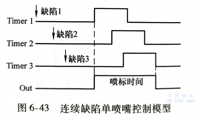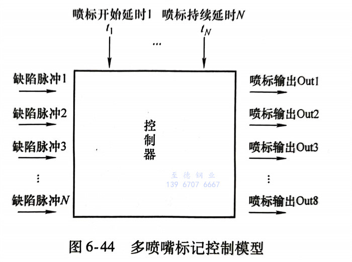 在(zai)如(ru)圖6-43所(suo)示過程(cheng)中,一(yi)個標(biao)(biao)記(ji)(ji)(ji)周期內(nei)連續(xu)(xu)出(chu)(chu)現(xian)三(san)個缺陷(xian)(xian),分(fen)(fen)(fen)別(bie)(bie)由三(san)個定時(shi)器進行上升沿捕獲,然后分(fen)(fen)(fen)別(bie)(bie)延時(shi),共(gong)同輸(shu)出(chu)(chu),因此三(san)個連續(xu)(xu)缺陷(xian)(xian)點的標(biao)(biao)記(ji)(ji)(ji)效果為一(yi)條連續(xu)(xu)的標(biao)(biao)記(ji)(ji)(ji)線,而(er)不會出(chu)(chu)現(xian)遺(yi)漏(lou)標(biao)(biao)記(ji)(ji)(ji)的情況。然而(er),不同位置(zhi)的缺陷(xian)(xian)產生了(le)一(yi)條連續(xu)(xu)標(biao)(biao)記(ji)(ji)(ji)線,雖(sui)然沒(mei)有出(chu)(chu)現(xian)遺(yi)漏(lou),但是標(biao)(biao)記(ji)(ji)(ji)分(fen)(fen)(fen)辨率降低了(le),遺(yi)失了(le)精(jing)確的對應(ying)關(guan)系。為提高標(biao)(biao)記(ji)(ji)(ji)精(jing)確度(du),將條狀探頭內(nei)部檢(jian)測(ce)元件獨(du)立分(fen)(fen)(fen)類,分(fen)(fen)(fen)別(bie)(bie)設(she)置(zhi)不同的延時(shi)周期,并采用多噴(pen)(pen)嘴進行標(biao)(biao)記(ji)(ji)(ji),多噴(pen)(pen)嘴標(biao)(biao)記(ji)(ji)(ji)控制模型(xing)如(ru)圖6-44所(suo)示。