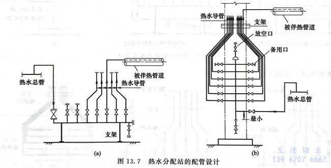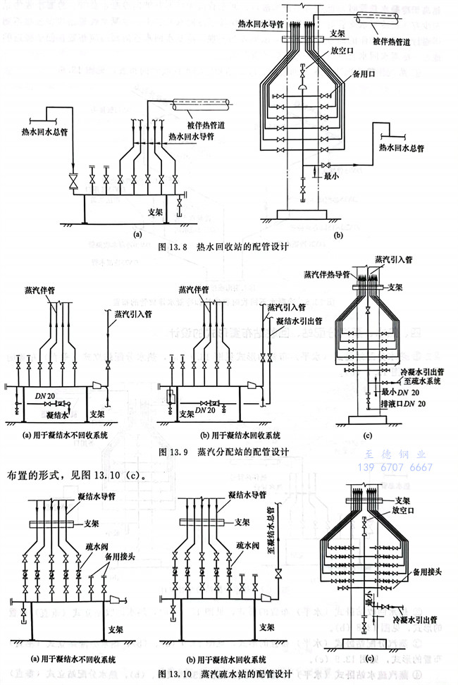 ③. 蒸汽分(fen)配站臥式(水(shui)平)布置(zhi)的形(xing)(xing)式,見圖13.9(a)、(b),熱水(shui)分(fen)配站立式(垂直)布置(zhi)的形(xing)(xing)式,見圖13.9(c)。