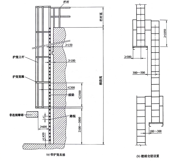 ①. 單段(duan)梯(ti)高宜不大于10m,攀(pan)登(deng)高度大于10m時(shi)宜采用多(duo)段(duan)梯(ti),梯(ti)段(duan)水(shui)平(ping)交錯布置,并設梯(ti)間(jian)(jian)平(ping)臺,平(ping)臺的垂(chui)直間(jian)(jian)距宜為6m。單段(duan)梯(ti)及多(duo)段(duan)梯(ti)的梯(ti)高均(jun)應不大于15m。