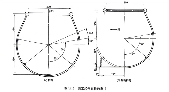 按(an)照SH/T 3011《石(shi)油化工工藝裝置(zhi)布(bu)置(zhi)設計規范》要求(qiu):高(gao)(gao)度(du)超過(guo)3m的直(zhi)(zhi)梯應(ying)設置(zhi)安全護籠,護籠下(xia)端(duan)距地面(mian)或平臺不應(ying)小于2.1m,護籠上(shang)端(duan)高(gao)(gao)出平臺面(mian),應(ying)與欄桿高(gao)(gao)度(du)一致。固(gu)定式鋼直(zhi)(zhi)梯示意(yi)圖見圖14.2。