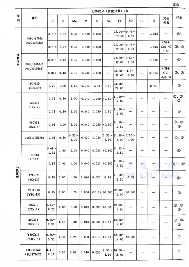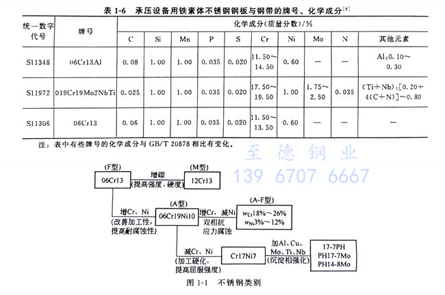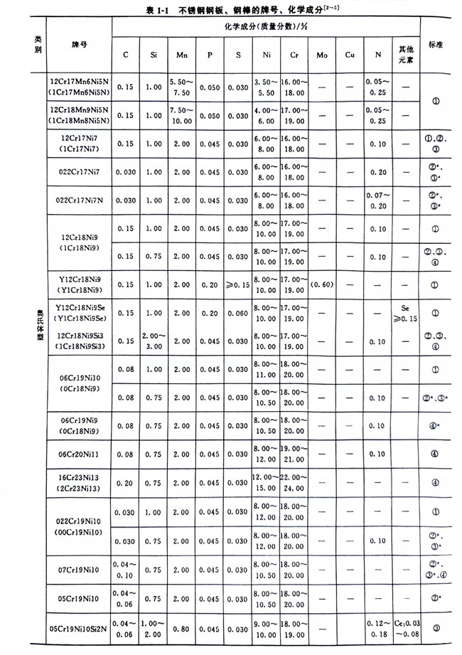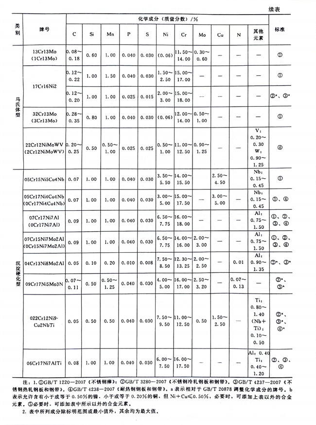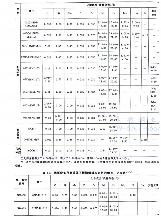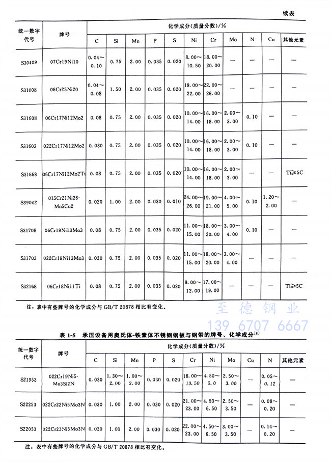 從表1-1~表1-6、表1-8可以看到,不銹鋼和耐熱鋼(gang)相互之間的許多牌號的化學成分、力學性能等是相同的,這些牌號的材料既可作為不銹鋼使用,也可作為耐熱鋼使用。