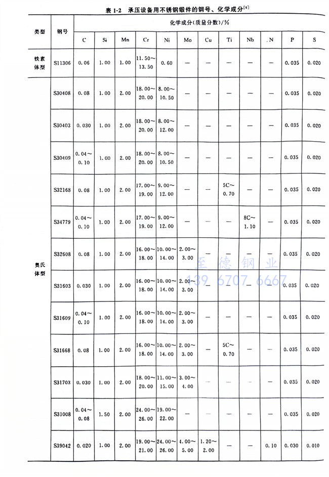 我國至少已制定了62項不銹鋼(gang)管材料標準(其中國家標準38項,冶金行業標準16項,航空航天標準6項、機械行業標準1項、能源局標準1項),每個標準均規定了材料的化學成分、力學性能等技術要求。在機械工程上應用最多的不銹鋼材料與標準包括GB/T3280-2007《不銹鋼冷軋鋼板和鋼帶》(該標準正在修訂中)、GB/T 4237-2007《不銹鋼熱軋鋼板和鋼帶》(不得用于鍋爐壓力容器制造,該標準正在修訂中)和GB/T 4238-2007《耐熱鋼鋼板和鋼帶》、GB 24511-2009《承壓設備用不銹鋼鋼板及鋼帶》、NB/T 47010-2010(JB/T 4728)《承壓設備用不銹鋼和耐熱鋼鍛件》,常見的不銹鋼牌號、化學成分和類別,見表1-1~表1-6。