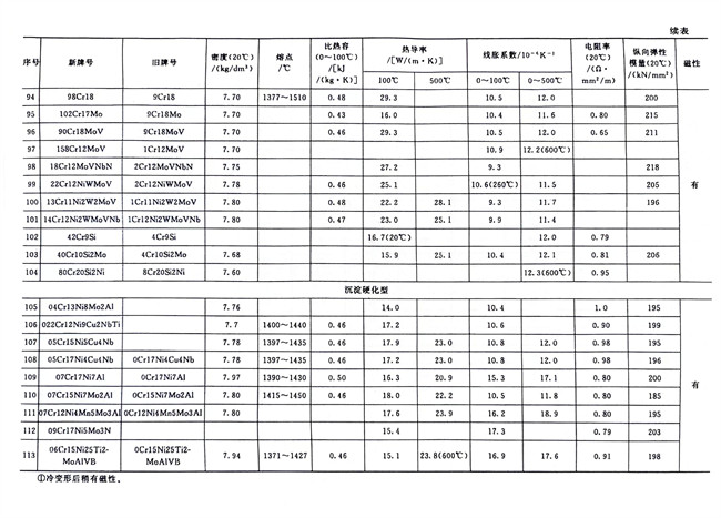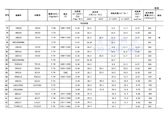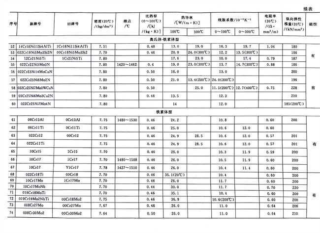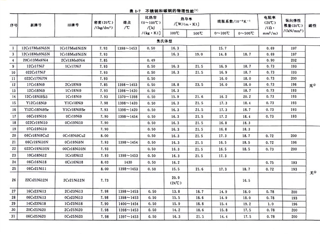 不銹鋼和碳鋼的物理性能數據對照見表1-7。從表中可知,碳鋼的密度略高于鐵素體型和馬氏(shi)體型不銹(xiu)鋼(gang),而略低于奧(ao)氏體(ti)型(xing)不銹鋼;電阻率按碳鋼、鐵素體型、馬氏體型和奧氏體型不銹(xiu)鋼排序依次遞增;線脹系數大小的排序也類似,奧氏體型不銹鋼最高而碳鋼最小;碳鋼、鐵素體型和馬氏體型不銹鋼有磁性,奧氏體型不銹鋼無磁性,但其冷加工硬化生成馬氏體相變時將會產生磁性,可用熱處理方法來消除這種馬氏體組織而恢復其無磁性。
