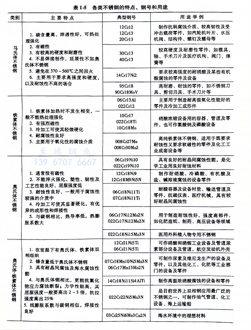 不銹鋼的類別主要有馬氏體不銹鋼、奧氏體不銹鋼、鐵素體不銹鋼、奧氏體-鐵素體雙相不銹鋼以及沉淀硬化型不銹鋼。浙江至德鋼業有限公司本次節主要介紹各類不銹(xiu)鋼的特性、特點以及典型鋼號的用途。其中,馬氏體不銹鋼、奧氏體不銹鋼、鐵素體不銹鋼、奧氏體-鐵素體雙相不銹鋼的主要特性比較見表1-4,各類不銹鋼的特點、鋼號和用途見表1-5。