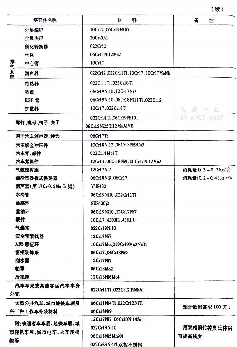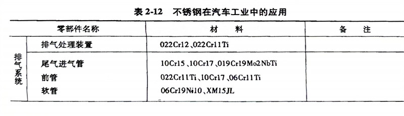 當前汽車工業的技術發展面臨著四大挑戰,即減少污染、節約能源、降低成本和安全措施。在汽車尾氣排放中采用強制性控制措施,不銹鋼(gang)在排氣系統上得到應用。國際上現代轎車發動機的排氣系統都采用不銹鋼制造,其中80%為鐵素體不銹鋼(022Cr12、022Cr11Ti、10Cr15、10Cr17、019Cr19Mo2NbTi等)制造,每輛車大約使用不銹鋼23~25kg;按每年生產200萬輛車計算,鐵素體不銹鋼年消耗量為5萬噸。汽車上其他零件,如消聲器、緊固件、沖壓件以及一些零部件都需要用不銹鋼制造。其應用情況見表2-12。