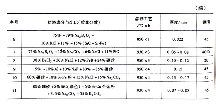 液(ye)體滲(shen)硼(peng)是在坩堝爐(lu)內進行。硼(peng)砂為(wei)(wei)主鹽,約占70%(質量分數)以上(shang),適(shi)當(dang)添加碳酸鹽、氯化物、氟化鈉及氟氯酸鈉等,可以改善鹽浴(yu)的(de)(de)流動(dong)性(xing),并(bing)以金剛(gang)砂、鋁(lv)粉、硅鈣合(he)金、硅鐵等作為(wei)(wei)還原劑(ji)。熔鹽滲(shen)硼(peng)的(de)(de)溫度一般為(wei)(wei)950~1000℃,時(shi)間一般不(bu)(bu)超過6h,時(shi)間過長易使(shi)滲(shen)硼(peng)層(ceng)變脆,熔鹽滲(shen)硼(peng)設備比較簡(jian)單,操作方便,工件沾鹽后不(bu)(bu)易清洗,帶有小孔、不(bu)(bu)通(tong)孔的(de)(de)零件不(bu)(bu)宜采(cai)用熔鹽滲(shen)硼(peng)。常用鹽浴(yu)滲(shen)硼(peng)的(de)(de)配方與工藝見(jian)表(biao)3-33。