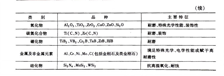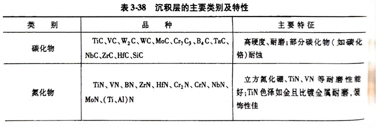 氣相沉(chen)(chen)積(ji)按形(xing)成(cheng)的基本原理(li),分為化(hua)學氣相沉(chen)(chen)積(ji)(CVD)和物(wu)理(li)氣相沉(chen)(chen)積(ji)(PVD)。氣相沉(chen)(chen)積(ji)是在工件表(biao)面覆蓋一層厚度為0.5~10μm的過渡族元素(Ti、V、Cr、W、Nb等(deng))與C、N、O、B等(deng)形(xing)成(cheng)的化(hua)合物(wu),或單一的金(jin)屬及(ji)非金(jin)屬涂層,使零(ling)件表(biao)層改變(bian)化(hua)學成(cheng)分,并在其表(biao)面形(xing)成(cheng)功能性(例如(ru)超硬耐磨層)或裝飾性的化(hua)合物(wu)涂層的新技術,現(xian)已廣(guang)泛應用于各類零(ling)件的硬化(hua)處(chu)理(li)。沉(chen)(chen)積(ji)層的主(zhu)要類別及(ji)特性見表(biao)3-38。