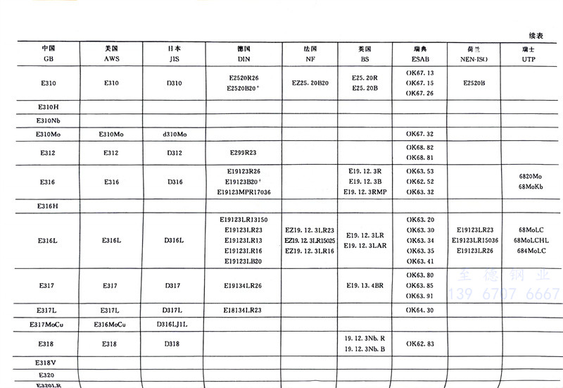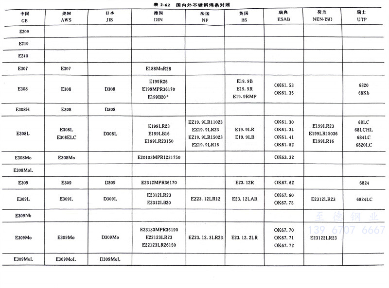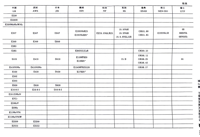 我國(guo)GB/T 983-2012《不(bu)銹鋼(gang)(gang)焊(han)(han)(han)(han)條(tiao)(tiao)(tiao)(tiao)》型(xing)(xing)號(hao)(hao)(hao)編排規(gui)(gui)則基本(ben)上采用美國(guo)AWS A5.4M:2006《耐蝕鉻鋼(gang)(gang)及鎳鋼(gang)(gang)焊(han)(han)(han)(han)條(tiao)(tiao)(tiao)(tiao)》的規(gui)(gui)定。我國(guo)不(bu)銹鋼(gang)(gang)焊(han)(han)(han)(han)條(tiao)(tiao)(tiao)(tiao)牌(pai)號(hao)(hao)(hao)、型(xing)(xing)號(hao)(hao)(hao)與美國(guo)AWS A5.4M標(biao)(biao)準的對(dui)應關(guan)(guan)系(xi)見表(biao)2-4、表(biao)2-6、表(biao)2-62。日本(ben)工(gong)業標(biao)(biao)準JIS Z3221不(bu)銹鋼(gang)(gang)焊(han)(han)(han)(han)條(tiao)(tiao)(tiao)(tiao)標(biao)(biao)準直(zhi)接(jie)采用美國(guo)AWS A5.4M標(biao)(biao)準焊(han)(han)(han)(han)條(tiao)(tiao)(tiao)(tiao)類(lei)別號(hao)(hao)(hao),只(zhi)是(shi)(shi)在(zai)焊(han)(han)(han)(han)條(tiao)(tiao)(tiao)(tiao)型(xing)(xing)號(hao)(hao)(hao)的三個數(shu)字(zi)前加(jia)“D”而不(bu)是(shi)(shi)“E”,例如(ru)JIS D308L-16,JIS D316-16等,日本(ben)不(bu)銹鋼(gang)(gang)焊(han)(han)(han)(han)條(tiao)(tiao)(tiao)(tiao)與中國(guo)不(bu)銹鋼(gang)(gang)焊(han)(han)(han)(han)條(tiao)(tiao)(tiao)(tiao)對(dui)應關(guan)(guan)系(xi)見表(biao)2-62。韓國(guo)的KS標(biao)(biao)準也(ye)采用AWS類(lei)別號(hao)(hao)(hao),只(zhi)是(shi)(shi)在(zai)焊(han)(han)(han)(han)條(tiao)(tiao)(tiao)(tiao)型(xing)(xing)號(hao)(hao)(hao)的三個數(shu)字(zi)前加(jia)“D”而不(bu)是(shi)(shi)“E”,例如(ru) KS D308L-16,KS D316-16等。