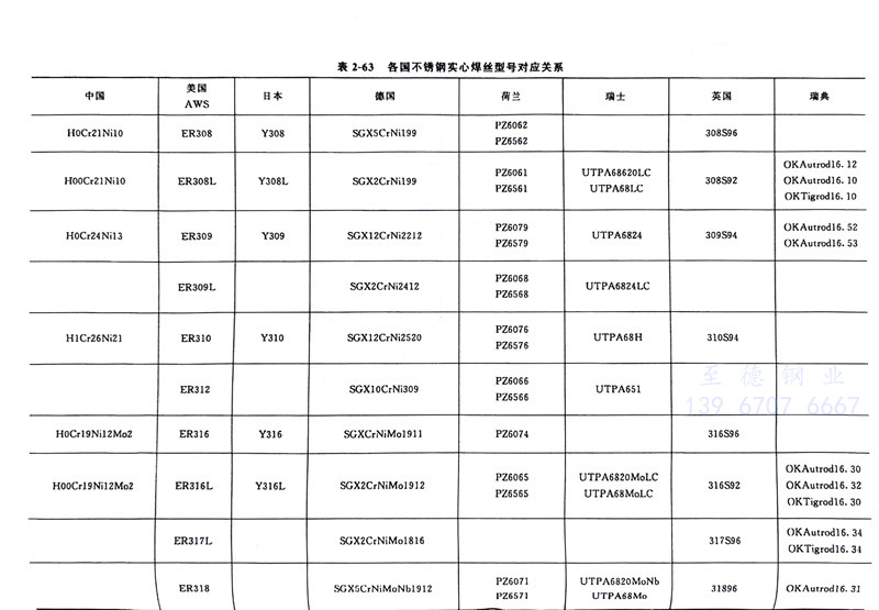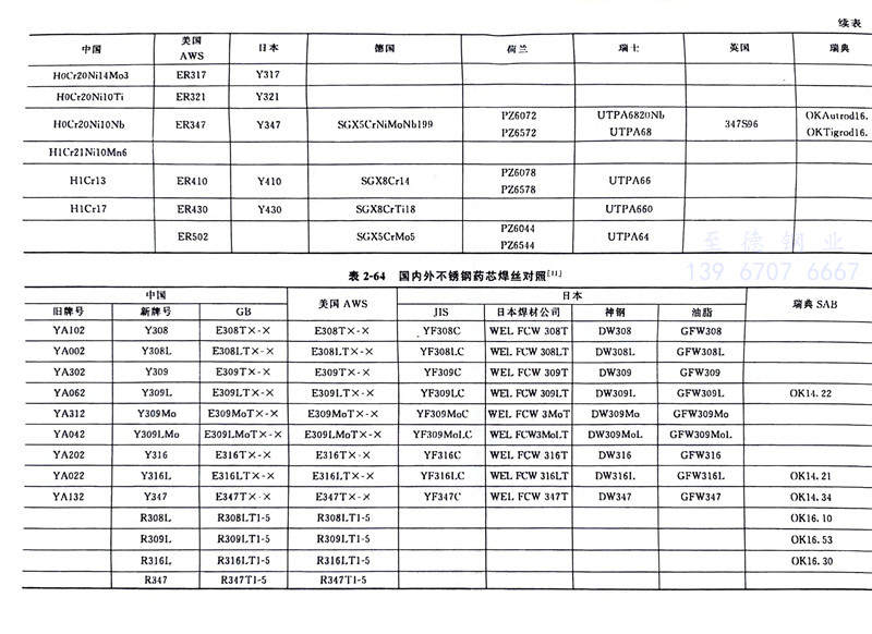 各國(guo)不銹鋼實心(xin)焊絲型號(hao)對(dui)應關系見(jian)表(biao)2-63,各國(guo)藥芯焊絲型號(hao)對(dui)應關系見(jian)表(biao)2-64。