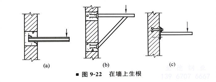 ③. 在(zai)墻上(shang)生根(gen)(圖9-22)。墻上(shang)預留孔、砌預制塊(帶有預埋鋼板),以及采用膨脹螺栓固定等。