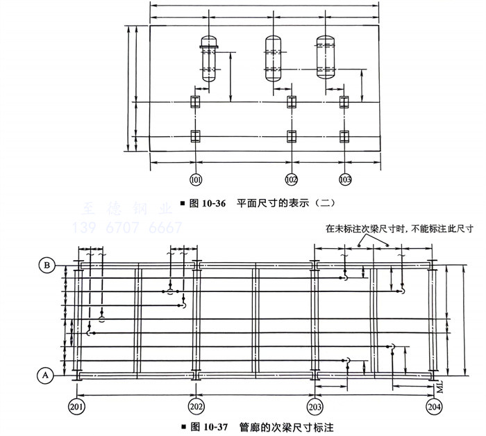 a. 管廊的次梁尺寸(cun)間距相(xiang)等時,則不(bu)需表(biao)示,除(chu)非管道尺寸(cun)從次梁引出,則必須表(biao)示(圖10-37)。