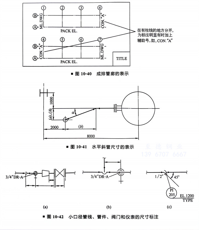 ⑧. 小口徑管線、管件、閥門和(he)儀表的尺寸標注如圖10-42所示(shi)。